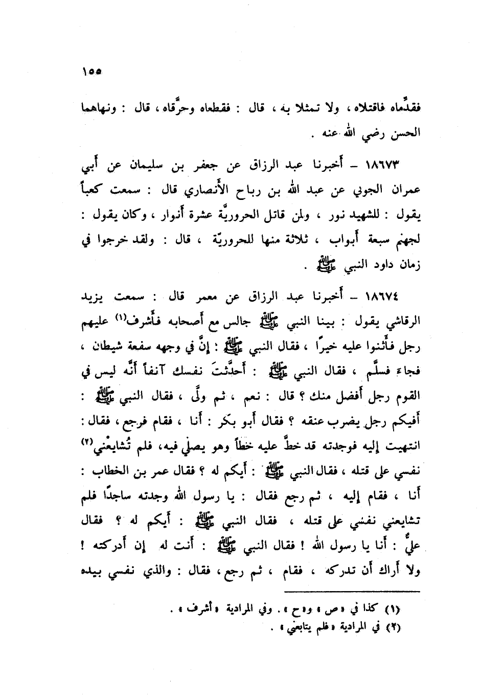 18674 - أَخْبَرَنَا عَبْدُ الرَّزَّاقِ، عَنْ مَعْمَرٍ , قَالَ: سَمِعْتُ يَزِيدَ الرَّقَاشِيَّ , يَقُولُ: بَيْنَا النَّبِيُّ صَلَّى اللهُ عَلَيْهِ وَسَلَّمَ جَالِسٌ مَعَ أَصْحَابِهِ فَأَشْرَفَ عَلَيْهِمْ رَجُلٌ , فَأَثْنَوْا عَلَيْهِ خَيْرًا , فَقَالَ النَّبِيُّ صَلَّى اللهُ عَلَيْهِ وَسَلَّمَ: «إِنَّ فِي وَجْهِهِ سَفْعَةَ شَيْطَانٍ» فَجَاءَ فَسَلَّمَ , فَقَالَ النَّبِيُّ صَلَّى اللهُ عَلَيْهِ وَسَلَّمَ: «أَحَدَّثْتَ نَفْسَكَ آنِفًا أَنَّهُ لَيْسَ فِي الْقَوْمِ رَجُلٌ أَفْضَلَ مِنْكَ؟» قَالَ: نَعَمْ , ثُمَّ وَلَّى فَقَالَ النَّبِيُّ صَلَّى اللهُ عَلَيْهِ وَسَلَّمَ: «أَفِيكُمْ رَجُلٌ يَضْرِبُ عُنُقَهُ؟» فَقَالَ أَبُو بَكْرٍ: أَنَا فَقَامَ فَرَجَعَ فَقَالَ: انْتَهَيْتُ إِلَيْهِ فَوَجَدْتُهُ قَدْ خَطَّ عَلَيْهِ خَطًّا , وَهُوَ يُصَلِّي فِيهِ , فَلَمْ تُشَايِعْنِي نَفْسِي , عَلَى قَتْلِهِ , فَقَالَ النَّبِيُّ صَلَّى اللهُ عَلَيْهِ وَسَلَّمَ: «أَيُّكُمْ لَهُ؟» فَقَالَ عُمَرُ بْنُ الْخَطَّابِ: أَنَا , فَقَامَ إِلَيْهِ ثُمَّ رَجَعَ فَقَالَ: يَا رَسُولَ اللَّهِ , وَجَدْتُهُ سَاجِدًا فَلَمْ تُشَايِعْنِي نَفْسِي عَلَى قَتْلِهِ , فَقَالَ النَّبِيُّ صَلَّى اللهُ عَلَيْهِ وَسَلَّمَ: «أَيُّكُمْ لَهُ؟» فَقَالَ عَلِيٌّ: أَنَا يَا رَسُولَ اللَّهِ , فَقَالَ النَّبِيُّ صَلَّى اللهُ عَلَيْهِ وَسَلَّمَ: «أَنْتَ لَهُ إِنْ أَدْرَكْتَهُ , وَلَا أُرَاكَ أَنْ تُدْرِكَهُ» فَقَامَ , ثُمَّ رَجَعَ فَقَالَ: وَالَّذِي نَفْسِي بِيَدِهِ -[156]- لَوْ وَجَدْتُهُ لَجِئْتُكَ بِرَأْسِهِ , فَقَالَ النَّبِيُّ صَلَّى اللهُ عَلَيْهِ وَسَلَّمَ: «§هَذَا أَوَّلُ قَرْنٍ مِنَ الشَّيْطَانِ طَلَعَ فِي أُمَّتِي , أَوْ أَوَّلُ قَرْنٍ طَلَعَ مِنْ أُمَّتِي , أَمَا إِنَّكُمْ لَوْ قَتَلْتُمُوهُ مَا اخْتَلَفَ مِنْكُمْ رَجُلَانِ , إِنَّ بَنِي إِسْرَائِيلَ اخْتَلَفُوا عَلَى إِحْدَى أَوِ اثْنَتَيْنِ وَسَبْعِينَ فِرْقَةً , وَإِنَّكُمْ سَتَخْتَلِفُونَ مِثْلَهُمْ , أَوْ أَكْثَرَ , لَيْسَ مِنْهَا صَوَابٌ إِلَّا وَاحِدَةٌ» قِيلَ: يَا رَسُولَ اللَّهِ , وَمَا هَذِهِ الْوَاحِدَةُ؟ قَالَ: «الْجَمَاعَةُ وَآخِرُهَا فِي النَّارِ»