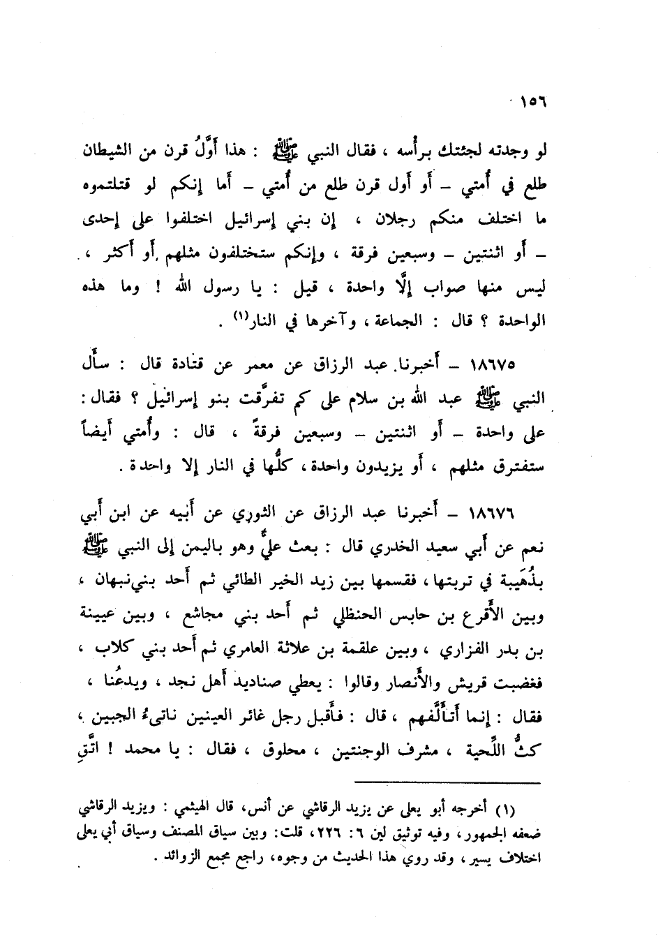 18675 - أَخْبَرَنَا عَبْدُ الرَّزَّاقِ، عَنْ مَعْمَرٍ , عَنْ قَتَادَةَ , قَالَ: سَأَلَ النَّبِيُّ صَلَّى اللهُ عَلَيْهِ وَسَلَّمَ عَبْدَ اللَّهِ بْنَ سَلَامٍ: عَلَى كَمْ تَفَرَّقَتْ بَنُو إِسْرَائِيلَ؟ فَقَالَ: عَلَى وَاحِدَةٍ , أَوِ اثْنَتَيْنِ وَسَبْعِينَ فِرْقَةً. قَالَ: «§وَأُمَّتِي أَيْضًا سَتَفْتَرِقُ مِثْلَهُمْ , أَوْ يَزِيدُونَ وَاحِدَةً , كُلُّهَا فِي النَّارِ إِلَّا وَاحِدَةً»