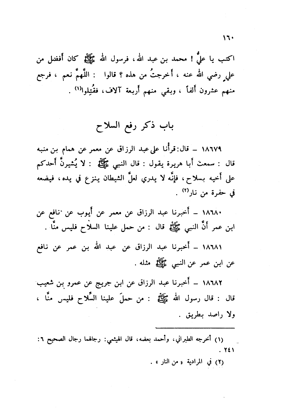 18679 - قَالَ: قَرَأْنَا عَلَى عَبْدِ الرَّزَّاقِ، عَنْ مَعْمَرٍ , عَنْ هَمَّامِ بْنِ مُنَبِّهٍ , قَالَ: سَمِعْتُ أَبَا هُرَيْرَةَ , يَقُولُ: قَالَ النَّبِيُّ صَلَّى اللهُ عَلَيْهِ وَسَلَّمَ: «§لَا يُشِيرَنَّ أَحَدُكُمْ عَلَى أَخِيهِ بِسِلَاحٍ , فَإِنَّهُ لَا يَدْرِي , لَعَلَّ الشَّيْطَانَ يَنْزِعُ فِي يَدِهِ , فَيَضَعُهُ فِي حُفْرَةٍ مِنْ نَارٍ»