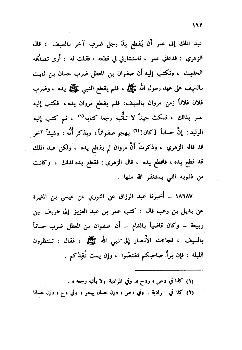 18687 - أَخْبَرَنَا عَبْدُ الرَّزَّاقِ، عَنِ الثَّوْرِيِّ , عَنْ عِيسَى بْنِ الْمُغِيرَةِ , عَنْ بُدَيْلِ بْنِ وَهْبٍ , قَالَ: كَتَبَ عُمَرُ بْنُ عَبْدِ الْعَزِيزِ إِلَى طَرِيفِ بْنِ رَبِيعَةَ وَكَانَ قَاضِيًا بِالشَّامِ أَنَّ صَفْوَانَ بْنَ الْمُعَطَّلِ ضَرَبَ حَسَّانًا بِالسَّيْفِ , فَجَاءَتْ الْأَنْصَارُ إِلَى نَبِيِّ اللَّهِ صَلَّى اللهُ عَلَيْهِ وَسَلَّمَ فَقَالَ: «§تَنْتَظِرُونَ اللَّيْلَةَ , فَإِنْ بَرَأَ صَاحِبُكُمْ , تَقْتَصُّوا , وَإِنْ يَمُتْ نَقِدْكُمْ»