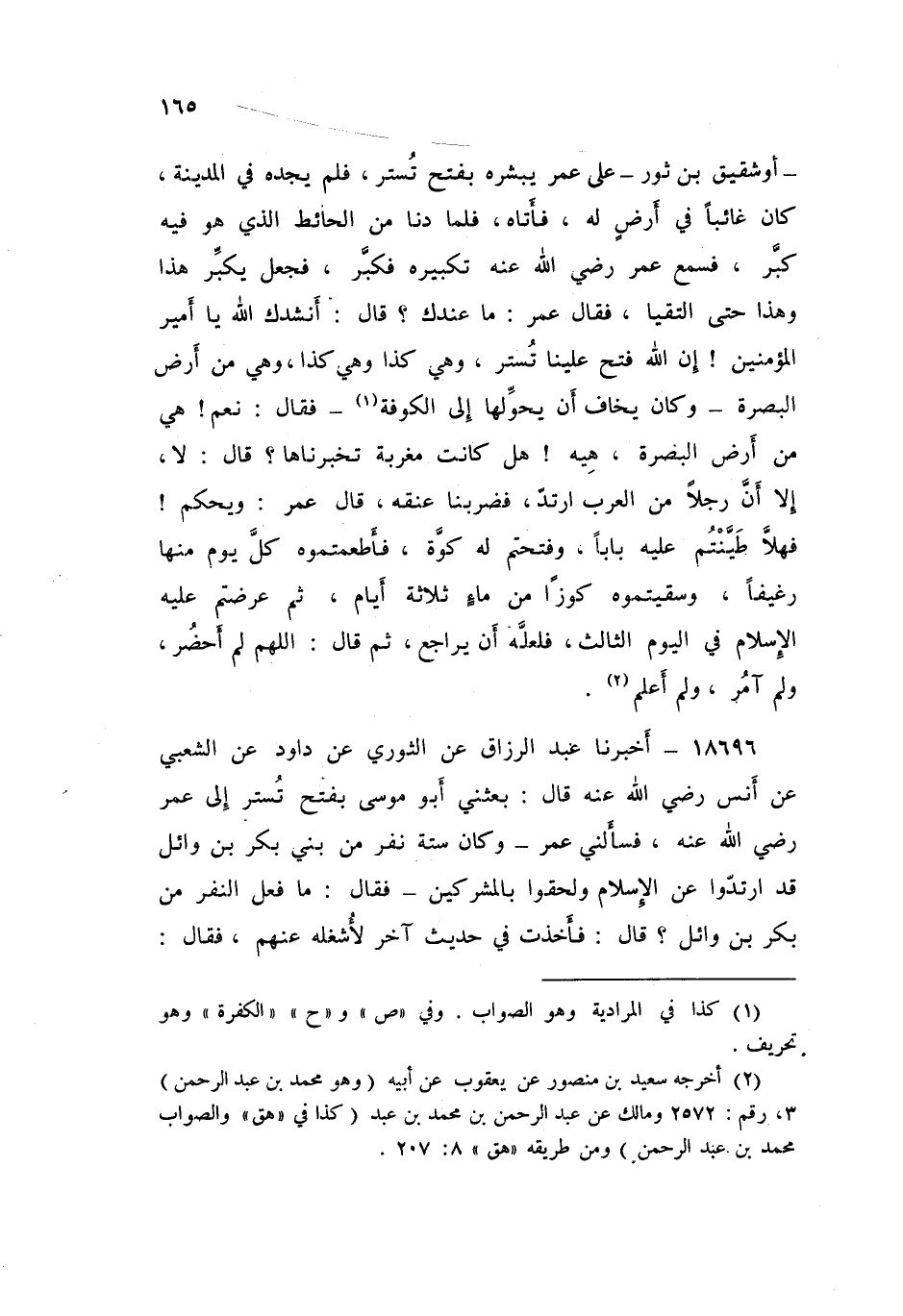 18696 - أَخْبَرَنَا عَبْدُ الرَّزَّاقِ، عَنِ الثَّوْرِيِّ , عَنْ دَاوُدَ , عَنِ الشَّعْبِيِّ , عَنْ أَنَسٍ رَضِيَ اللَّهُ عَنْهُ , قَالَ: بَعَثَنِي أَبُو مُوسَى بِفَتْحِ تُسْتَرَ إِلَى عُمَرَ رَضِيَ اللَّهُ عَنْهُ , فَسَأَلَنِي عُمَرُ - وَكَانَ سِتَّةُ نَفَرٍ مِنْ بَنِي بَكْرِ بْنِ وَائِلٍ قَدِ ارْتَدُّوا عَنِ الْإِسْلَامِ , وَلَحِقُوا بِالْمُشْرِكِينَ - , فَقَالَ: «مَا فَعَلَ النَّفَرُ مِنْ بَكْرِ بْنِ وَائِلٍ؟» قَالَ: فَأَخَذْتُ فِي حَدِيثٍ آخَرَ لِأُشْغِلَهُ عَنْهُمْ , فَقَالَ -[166]-: «مَا فَعَلَ النَّفَرُ مِنْ بَكْرِ بْنِ وَائِلٍ؟» قُلْتُ: يَا أَمِيرَ الْمُؤْمِنِينَ , قَوْمٌ ارْتَدُّوا عَنِ الْإِسْلَامِ , وَلَحِقُوا بِالْمُشْرِكِينَ , مَا سَبِيلُهُمْ إِلَّا الْقَتْلَ , فَقَالَ عُمَرُ: «لَأَنْ أَكُونَ أَخَذْتُهُمْ سِلْمًا , أَحَبُّ إِلَيَّ مِمَّا طَلَعَتْ عَلَيْهِ الشَّمْسُ مِنْ صَفْرَاءَ أَوْ بَيْضَاءَ» , قَالَ: قُلْتُ: يَا أَمِيرَ الْمُؤْمِنِينَ , وَمَا كُنْتَ صَانِعًا بِهِمْ لَوْ أَخَذْتَهُمْ؟ قَالَ: «كُنْتُ §عَارِضًا عَلَيْهِمُ الْبَابَ الَّذِي خَرَجُوا مِنْهُ , أَنْ يَدْخُلُوا فِيهِ , فَإِنْ فَعَلُوا ذَلِكَ , قَبِلْتُ مِنْهُمْ , وَإِلَّا اسْتَوْدَعْتُهُمُ السِّجْنَ»