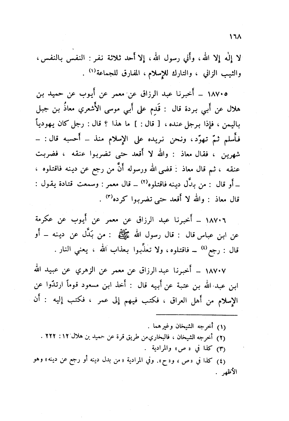 18705 - أَخْبَرَنَا عَبْدُ الرَّزَّاقِ، عَنْ مَعْمَرٍ , عَنْ أَيُّوبَ , عَنْ حُمَيْدِ بْنِ هِلَالٍ , عَنْ أَبِي بُرْدَةَ , قَالَ: قَدِمَ عَلَى أَبِي مُوسَى الْأَشْعَرِيِّ , مُعَاذُ بْنُ جَبَلٍ بِالْيَمَنِ فَإِذَا بِرَجُلٍ عِنْدَهُ قَالَ: «مَا هَذَا؟» قَالَ: رَجُلٌ كَانَ يَهُودِيًّا فَأَسْلَمَ , ثُمَّ تَهَوَّدَ , وَنَحْنُ نُرِيدُهُ عَلَى الْإِسْلَامِ مُنْذُ أَحْسَبُهُ , قَالَ شَهْرَيْنِ , فَقَالَ مُعَاذٌ: «وَاللَّهِ لَا أَقْعُدُ حَتَّى تَضْرِبُوا عُنُقَهُ» فَضُرِبَتْ عُنُقُهُ , ثُمَّ قَالَ مُعَاذٌ: «§قَضَى اللَّهُ وَرَسُولُهُ أَنَّ مَنْ رَجَعَ عَنْ دِينِهِ , فَاقْتُلُوهُ» أَوْ قَالَ: «مَنْ بَدَّلَ دِينَهُ فَاقْتُلُوهُ» قَالَ مَعْمَرٌ: وَسَمِعْتُ قَتَادَةَ يَقُولُ: قَالَ مُعَاذٌ: «وَاللَّهِ لَا أَقْعُدُ حَتَّى تَضْرِبُوا كَرْدَهُ»