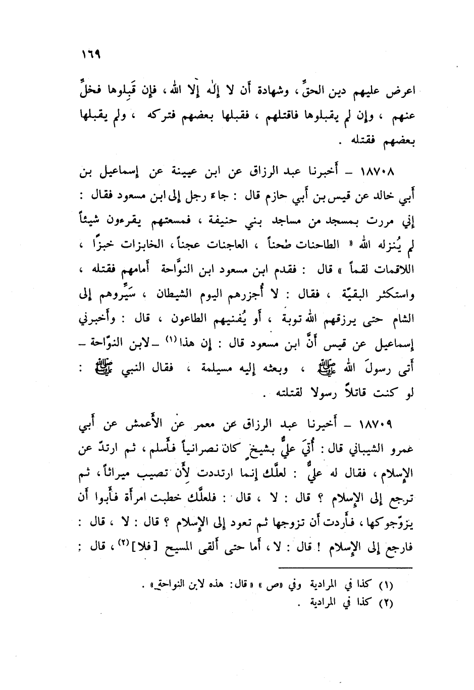 18708 - أَخْبَرَنَا عَبْدُ الرَّزَّاقِ، عَنِ ابْنِ عُيَيْنَةَ , عَنْ إِسْمَاعِيلَ بْنِ أَبِي خَالِدٍ , عَنْ قَيْسِ بْنِ أَبِي حَازِمٍ , قَالَ: جَاءَ رَجُلٌ إِلَى ابْنِ مَسْعُودٍ , فَقَالَ: إِنِّي مَرَرْتُ بِمَسْجِدٍ مِنْ مَسَاجِدِ بَنِي حَنِيفَةَ فَسَمِعْتُهُمْ يَقْرَءُونَ شَيْئًا لَمْ يُنَزِّلْهُ اللَّهُ الطَّاحِنَاتِ طَحْنًا , الْعَاجِنَاتِ عَجْنًا , الْخَابِزَاتِ خَبْزًا , اللَّاقِمَاتِ لَقْمًا , قَالَ: فَقَدَّمَ ابْنُ مَسْعُودٍ ابْنَ النَّوَّاحَةِ أمَامَهُمْ فَقَتَلَهُ , وَاسْتَكْثَرَ الْبَقِيَّةَ , فَقَالَ: «§لَا أُجْزِرُهُمُ الْيَوْمَ الشَّيْطَانَ , سَيِّرُوهُمْ إِلَى الشَّامِ حَتَّى يَرْزُقَهُمُ اللَّهُ تَوْبَةً أَوْ يُفْنِيَهُمُ الطَّاعُونُ»