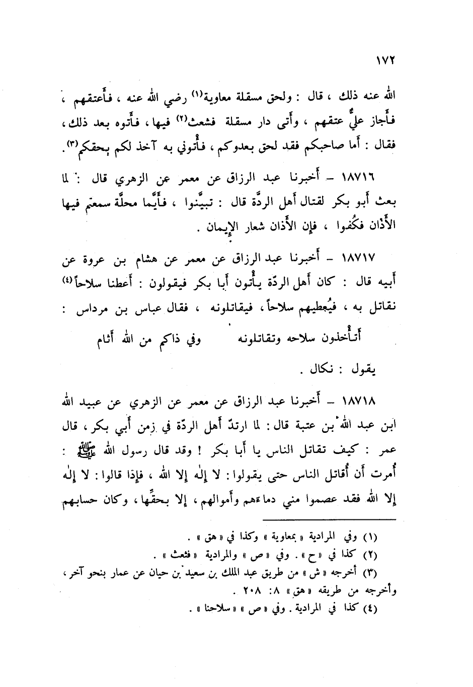 18717 - أَخْبَرَنَا عَبْدُ الرَّزَّاقِ، عَنْ مَعْمَرٍ , عَنْ هِشَامِ بْنِ عُرْوَةَ , عَنْ أَبِيهِ , قَالَ: كَانَ §أَهْلُ الرِّدَّةِ يَأْتُونَ أَبَا بَكْرٍ , فَيَقُولُونَ: «أَعْطِنَا سِلَاحًا نُقَاتِلْ بِهِ , فَيُعْطِيهِمْ سِلَاحًا , فَيُقَاتِلُونَهُ» فَقَالَ عَبَّاسُ بْنُ مِرْدَاسٍ: