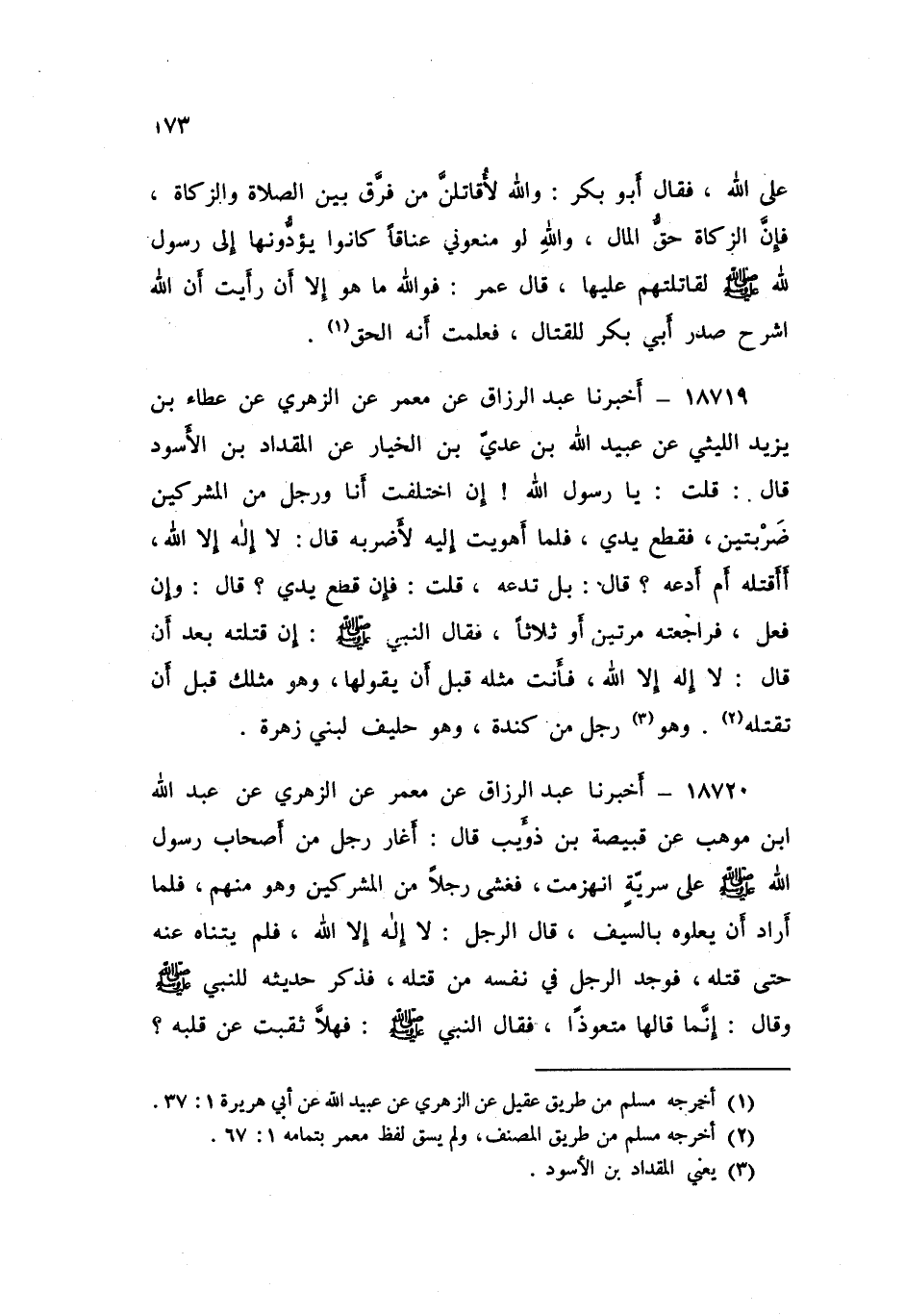 18719 - أَخْبَرَنَا عَبْدُ الرَّزَّاقِ، عَنْ مَعْمَرٍ , عَنِ الزُّهْرِيِّ , عَنْ عَطَاءِ بْنِ يَزِيدَ اللَّيْثِيِّ , عَنْ عُبَيْدِ اللَّهِ بْنِ عَدِيِّ بْنِ الْخِيَارِ , عَنِ الْمِقْدَادِ بْنِ الْأَسْوَدِ , قَالَ: قُلْتُ يَا رَسُولَ اللَّهِ: إِنِ اخْتَلَفْتُ أَنَا وَرَجُلٌ مِنَ الْمُشْرِكِينَ ضَرْبَتَيْنِ فَقَطَعَ يَدِي , فَلَمَّا أَهْوَيْتُ إِلَيْهِ لِأَضْرِبَهُ قَالَ: لَا إِلَهَ إِلَّا اللَّهُ أَأَقْتُلُهُ أَمْ أَدَعُهُ؟ قَالَ: «بَلْ تَدَعُهُ» قُلْتُ: فَإِنْ قَطَعَ يَدِي؟ قَالَ: «وَإِنْ فَعَلَ» فَرَاجَعْتَهُ مَرَّتَيْنِ أَوْ ثَلَاثًا فَقَالَ النَّبِيُّ صَلَّى اللهُ عَلَيْهِ وَسَلَّمَ: " §إِنْ قَتَلْتَهُ بَعْدَ أَنْ قَالَ: لَا إِلَهَ إِلَّا اللَّهُ , فَأَنْتَ مِثْلُهُ قَبْلَ أَنْ يَقُولَهَا , وَهُوَ مِثْلُكَ قَبْلَ أَنْ تَقْتُلَهُ " وَهُوَ رَجُلٌ مِنْ كِنْدَةَ وَهُوَ حَلِيفٌ لِبَنِي زُهْرَةَ