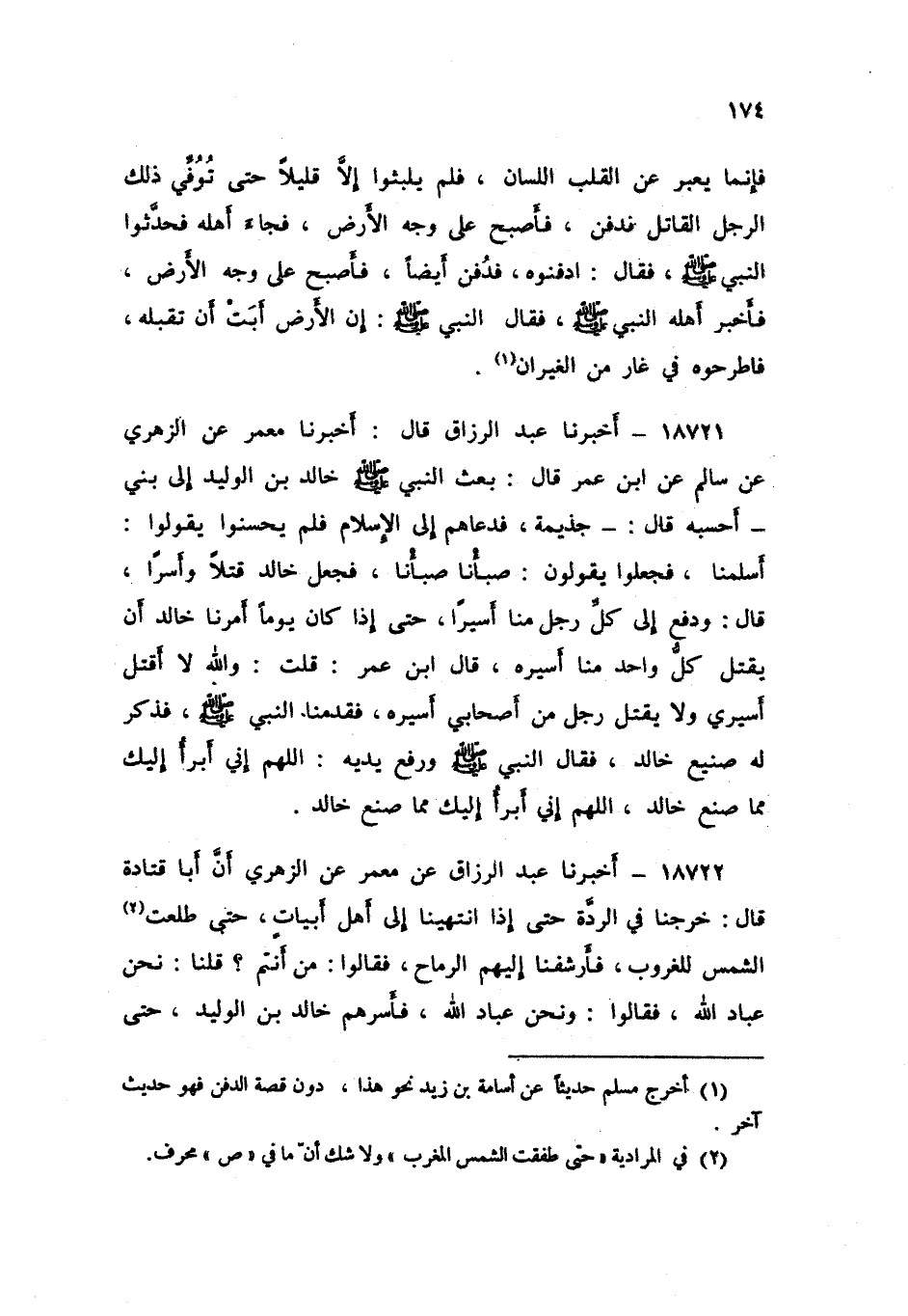 18721 - عَبْدُ الرَّزَّاقِ، أَخْبَرَنَا مَعْمَرٌ , عَنِ الزُّهْرِيِّ , عَنْ سَالِمٍ , عَنِ ابْنِ عُمَرَ , قَالَ: بَعَثَ النَّبِيُّ صَلَّى اللهُ عَلَيْهِ وَسَلَّمَ خَالِدَ بْنَ الْوَلِيدِ إِلَى بَنِي - أَحْسَبُهُ قَالَ - جَذِيمَةَ فَدَعَاهُمْ إِلَى الْإِسْلَامِ , فَلَمْ يُحْسِنُوا , يَقُولُوا: أَسْلَمْنَا , فَجَعَلُوا يَقُولُونَ: صَبَأْنَا صَبَأْنَا , فَجَعَلَ خَالِدٌ قَتْلًا وَأَسْرًا , قَالَ: وَدَفَعَ إِلَى كُلِّ رَجُلٍ مِنَّا أَسِيرًا , حَتَّى إِذَا كَانَ يَوْمًا , أَمَرَنَا خَالِدٌ أَنْ يَقْتُلَ كُلُّ وَاحِدٍ مِنَّا أَسِيرَهُ , قَالَ ابْنُ عُمَرَ , قُلْتُ: وَاللَّهِ لَا أَقْتُلُ أَسِيرِي , وَلَا يَقْتُلُ رَجُلٌ مِنْ أَصْحَابِي أَسِيرَهُ , فَقَدِمْنَا النَّبِيَّ صَلَّى اللهُ عَلَيْهِ وَسَلَّمَ فَذَكَرَ لَهُ صَنِيعَ خَالِدٍ فَقَالَ النَّبِيُّ صَلَّى اللهُ عَلَيْهِ وَسَلَّمَ وَرَفَعَ يَدَيْهِ: «§اللَّهُمَّ إِنِّي أَبْرَأُ إِلَيْكَ مِمَّا صَنَعَ خَالِدٌ اللَّهُمَّ إِنِّي أَبْرَأُ إِلَيْكَ مِمَّا صَنَعَ خَالِدٌ»