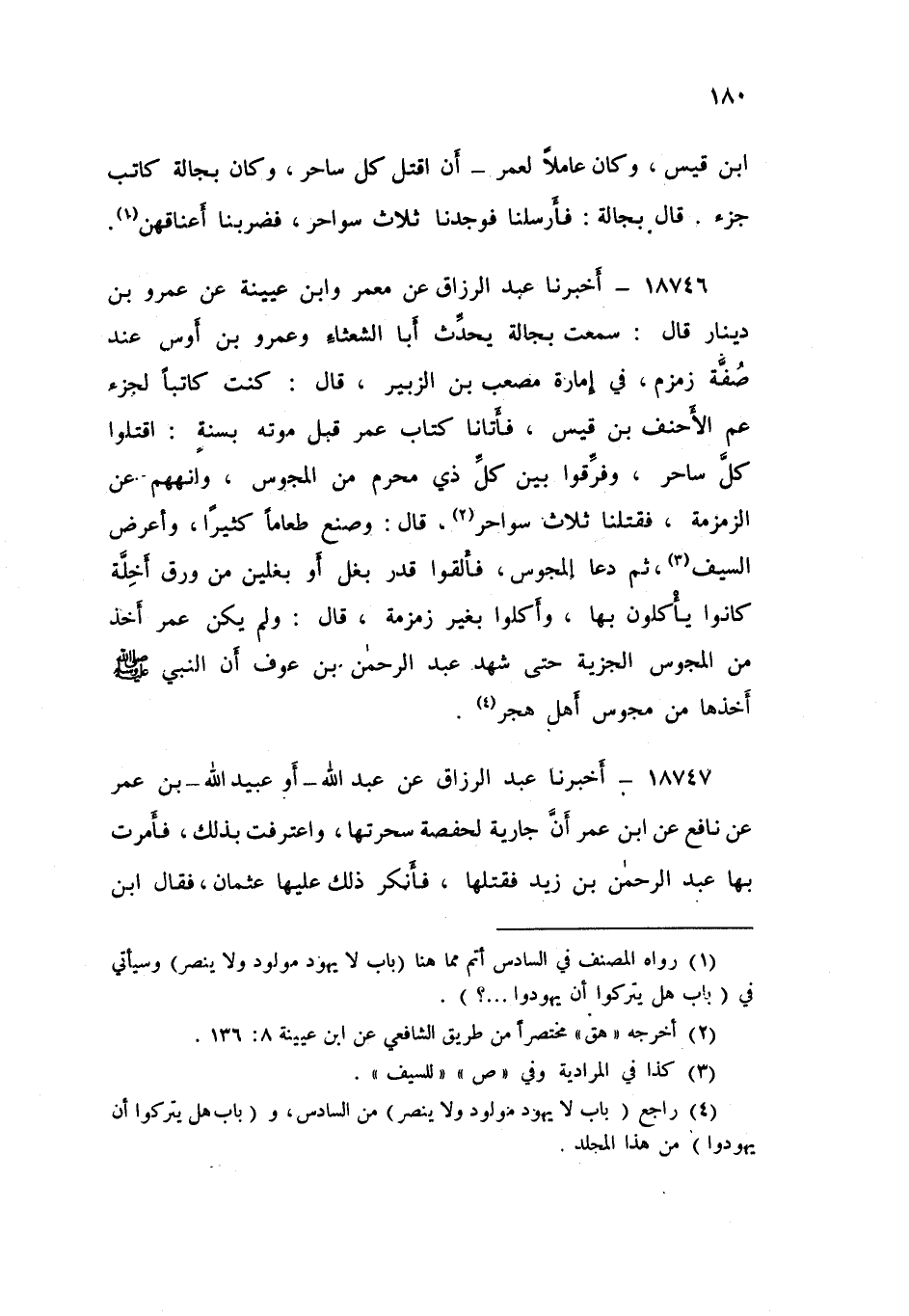 18746 - أَخْبَرَنَا عَبْدُ الرَّزَّاقِ، عَنْ مَعْمَرٍ , وَابْنِ عُيَيْنَةَ , عَنْ عَمْرِو بْنِ دِينَارٍ , قَالَ: سَمِعْتُ بَجَالَةَ , يُحَدِّثُ أَبَا الشَّعْثَاءِ , وَعَمْرَو بْنَ أَوْسٍ عِنْدَ صُفَّةِ زَمْزَمَ فِي إِمَارَةِ مُصْعَبِ بْنِ الزُّبَيْرِ , قَالَ: كُنْتُ كَاتِبًا لِجَزْءٍ عَمِّ الْأَحْنَفِ بْنِ قَيْسٍ فَأَتَانَا كِتَابُ عُمَرَ قَبْلَ مَوْتِهِ بِسَنَةٍ: «§اقْتُلُوا كُلَّ سَاحِرٍ , وَفَرِّقُوا بَيْنَ كُلِّ ذِي مَحْرَمٍ مِنَ الْمَجُوسِ , وَانْهَهُمْ عَنِ الزَّمْزَمَةِ» فَقَتَلْنَا ثَلَاثَ سَوَاحِرَ " , قَالَ: «وَصَنَعَ طَعَامًا كَثِيرًا وَأَعْرَضَ السَّيْفَ ثُمَّ دَعَا الْمَجُوسَ فَأَلْقَوْا قَدْرَ بَغْلٍ أَوْ بَغْلَيْنِ مِنْ وَرِقِ أَخِلَّةٍ , كَانُوا يَأْكُلُونَ بِهَا , وَأَكَلُوا بِغَيْرِ زَمْزَمَةٍ»