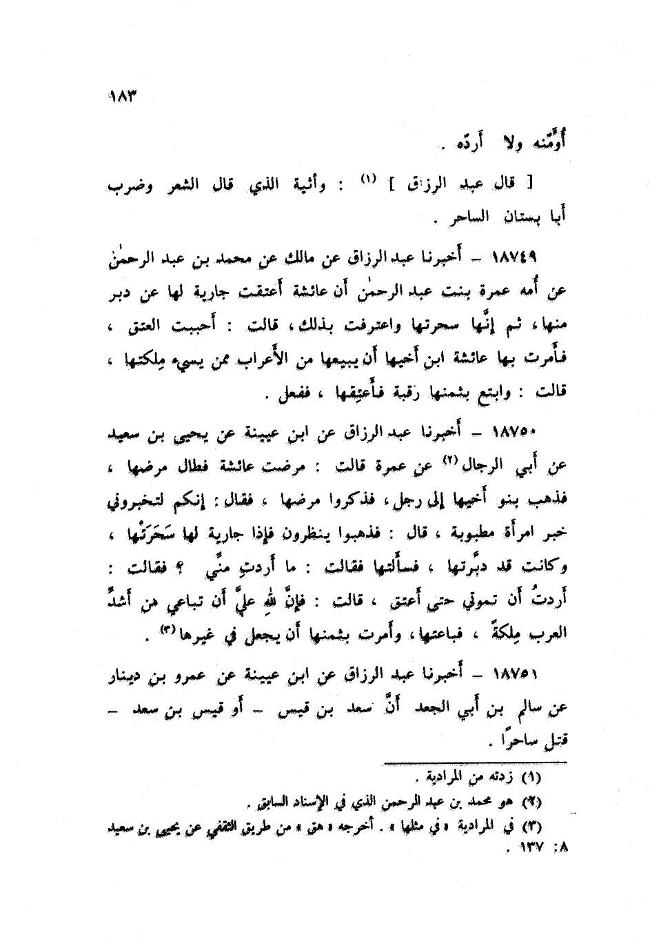 18750 - أَخْبَرَنَا عَبْدُ الرَّزَّاقِ، عَنِ ابْنِ عُيَيْنَةَ , عَنْ يَحْيَى بْنِ سَعِيدٍ , عَنْ أَبِي الرِّجَالِ , عَنْ عَمْرَةَ , قَالَتْ: مَرِضَتْ عَائِشَةُ فَطَالَ مَرَضُهَا , فَذَهَبَ بَنُو أَخِيهَا إِلَى رَجُلٍ فَذَكَرُوا مَرَضُهَا , فَقَالَ: إِنَّكُمْ لَتُخْبِرُونِي خَبَرَ امْرَأَةٍ مَطْبُوبَةٍ قَالَ: فَذَهَبُوا يَنْظُرُونَ فَإِذَا جَارِيَةٌ لَهَا سَحَرَتْهَا , وَكَانَتْ قَدْ دَبَّرَتْهَا , فَسَأَلَتْهَا فَقَالَتْ: «§مَا أَرَدْتِ مِنِّي؟» فَقَالَتْ: أَرَدْتُ أَنْ تَمُوتِي حَتَّى أُعْتَقَ , قَالَتْ: «فَإِنَّ لِلَّهِ عَلَيَّ أَنْ تُبَاعِي مِنْ أَشَدِّ الْعَرَبِ مِلْكَةً , فَبَاعَتْهَا , وَأَمَرَتْ بِثَمَنِهَا , أَنْ يُجْعَلَ فِي غَيْرِهَا»