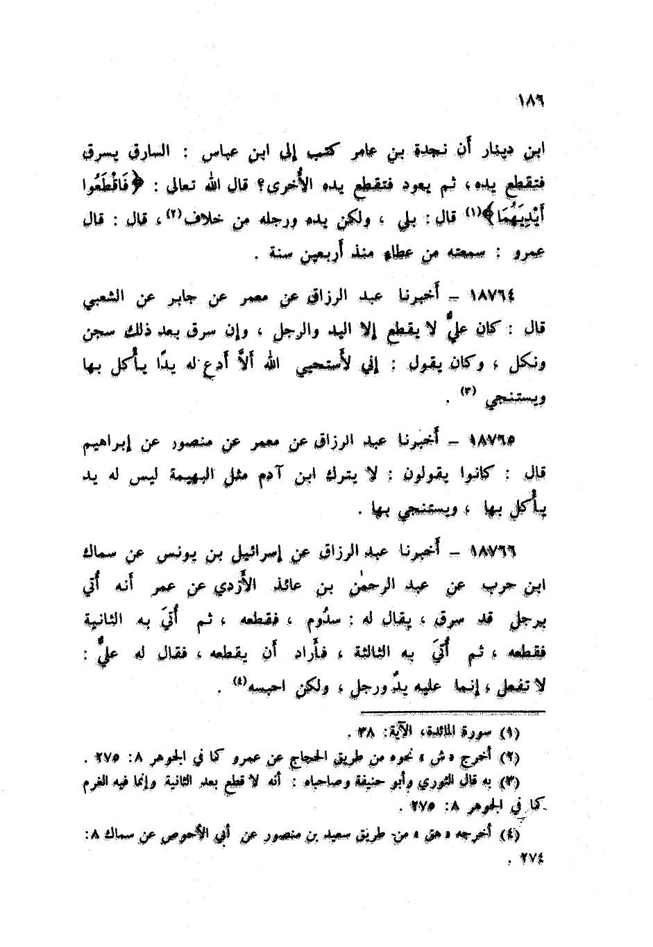 18764 - أَخْبَرَنَا عَبْدُ الرَّزَّاقِ، عَنْ مَعْمَرٍ , عَنْ جَابِرٍ , عَنِ الشَّعْبِيِّ , قَالَ: كَانَ عَلِيٌّ §لَا يَقْطَعُ إِلَّا الْيَدَ وَالرِّجْلَ , وَإِنْ سَرَقَ بَعْدَ ذَلِكَ سُجِنَ , وَنُكِّلَ , وَكَانَ يَقُولُ: «إِنِّي لَأَسْتَحْيِي اللَّهَ , أَلَّا أَدَعَ لَهُ يَدًا يَأْكُلُ بِهَا وَيَسْتَنْجِي»