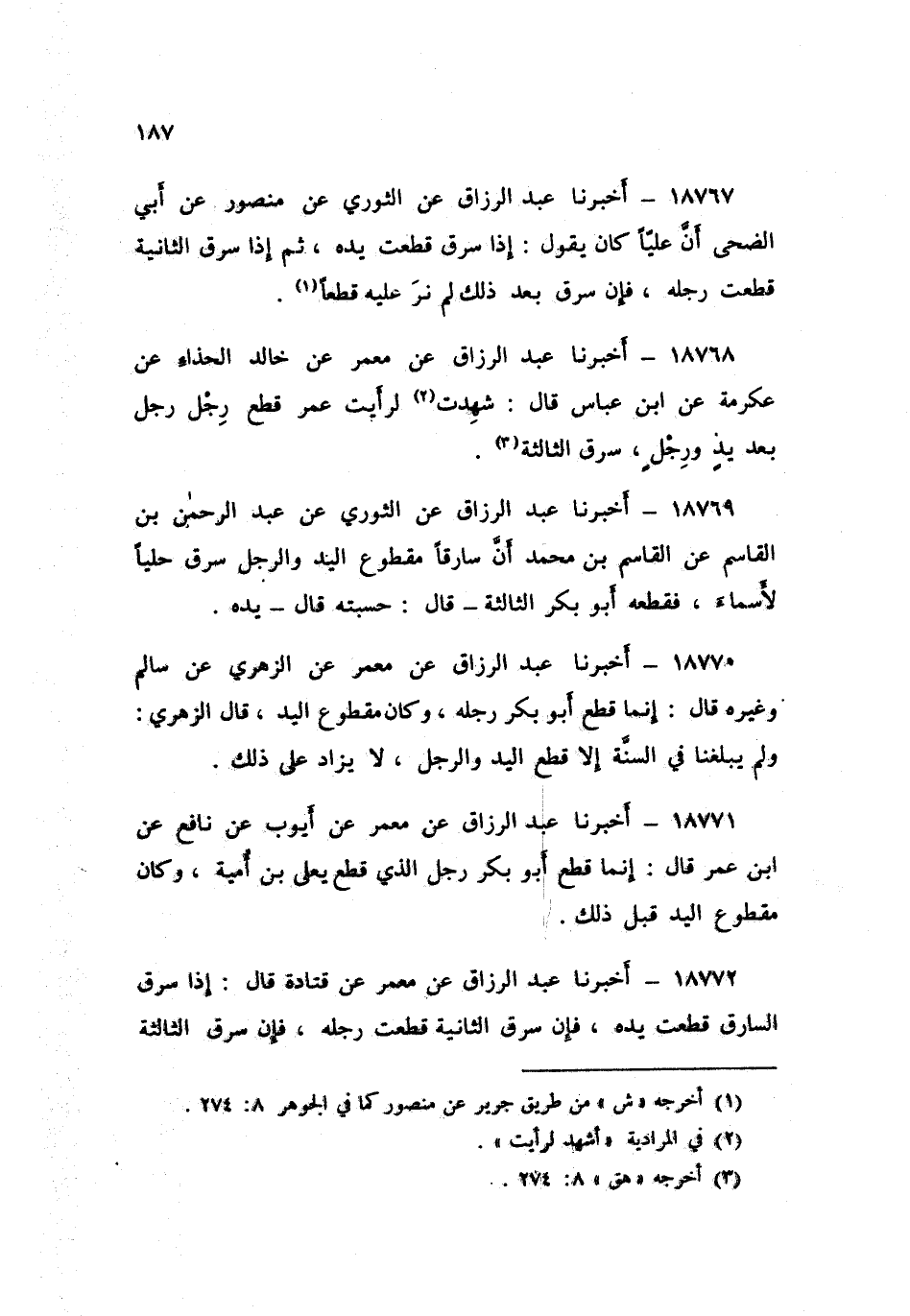 18768 - أَخْبَرَنَا عَبْدُ الرَّزَّاقِ، عَنْ مَعْمَرٍ , عَنْ خَالِدٍ الْحَذَّاءِ , عَنْ عِكْرِمَةَ , عَنِ ابْنِ عَبَّاسٍ , قَالَ: «§شَهِدْتُ لَرَأَيْتُ عُمَرَ قَطَعَ رِجْلَ رَجُلٍ , بَعْدَ يَدٍ وَرِجْلٍ؛ سَرَقَ الثَّالِثَةَ»