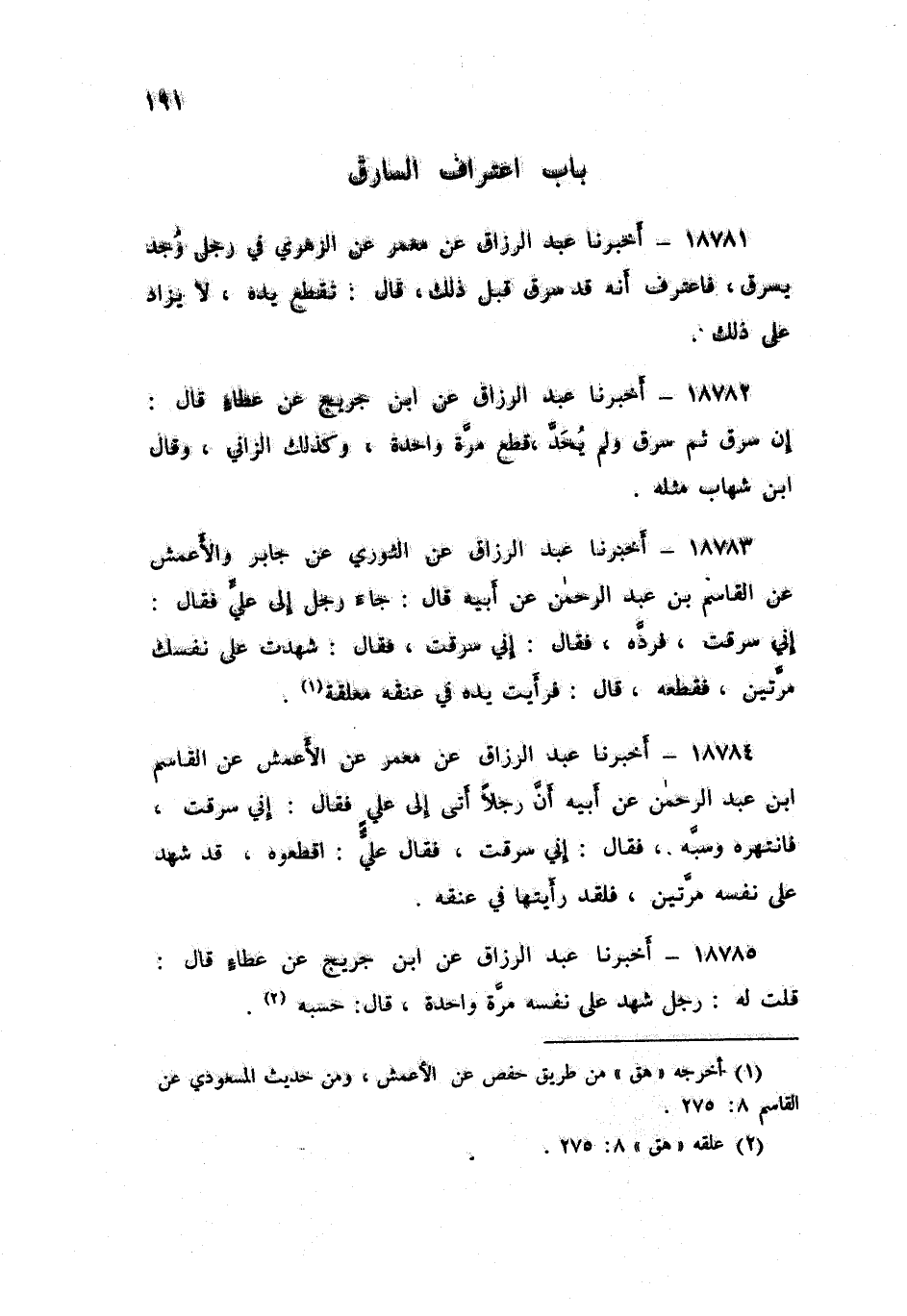 18784 - أَخْبَرَنَا عَبْدُ الرَّزَّاقِ، عَنْ مَعْمَرٍ , عَنِ الْأَعْمَشِ , عَنِ الْقَاسِمِ بْنِ عَبْدِ الرَّحْمَنِ , عَنْ أَبِيهِ , أَنَّ رَجُلًا أَتَى إِلَى عَلِيٍّ , فَقَالَ: إِنِّي سَرَقْتُ , فَانْتَهَرَهُ , وَسَبَّهُ , فَقَالَ: إِنِّي سَرَقْتُ , فَقَالَ عَلِيٌّ: «§اقْطَعُوهُ قَدْ شَهِدَ عَلَى نَفْسِهِ مَرَّتَيْنِ , فَلَقَدْ رَأَيْتُهَا فِي عُنُقِهِ»
