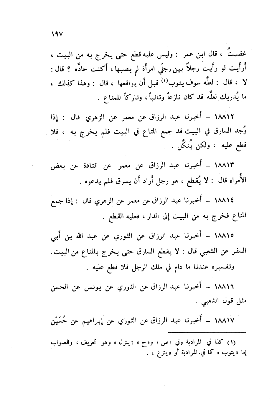 18812 - أَخْبَرَنَا عَبْدُ الرَّزَّاقِ، عَنْ مَعْمَرٍ , عَنِ الزُّهْرِيِّ , قَالَ: «§إِذَا وُجِدَ السَّارِقُ فِي الْبَيْتِ قَدْ جَمَعَ الْمَتَاعَ فِي الْبَيْتِ فَلَمْ يَخْرُجْ بِهِ , فَلَا قَطْعَ عَلَيْهِ , وَلَكِنْ يُنَكَّلُ»