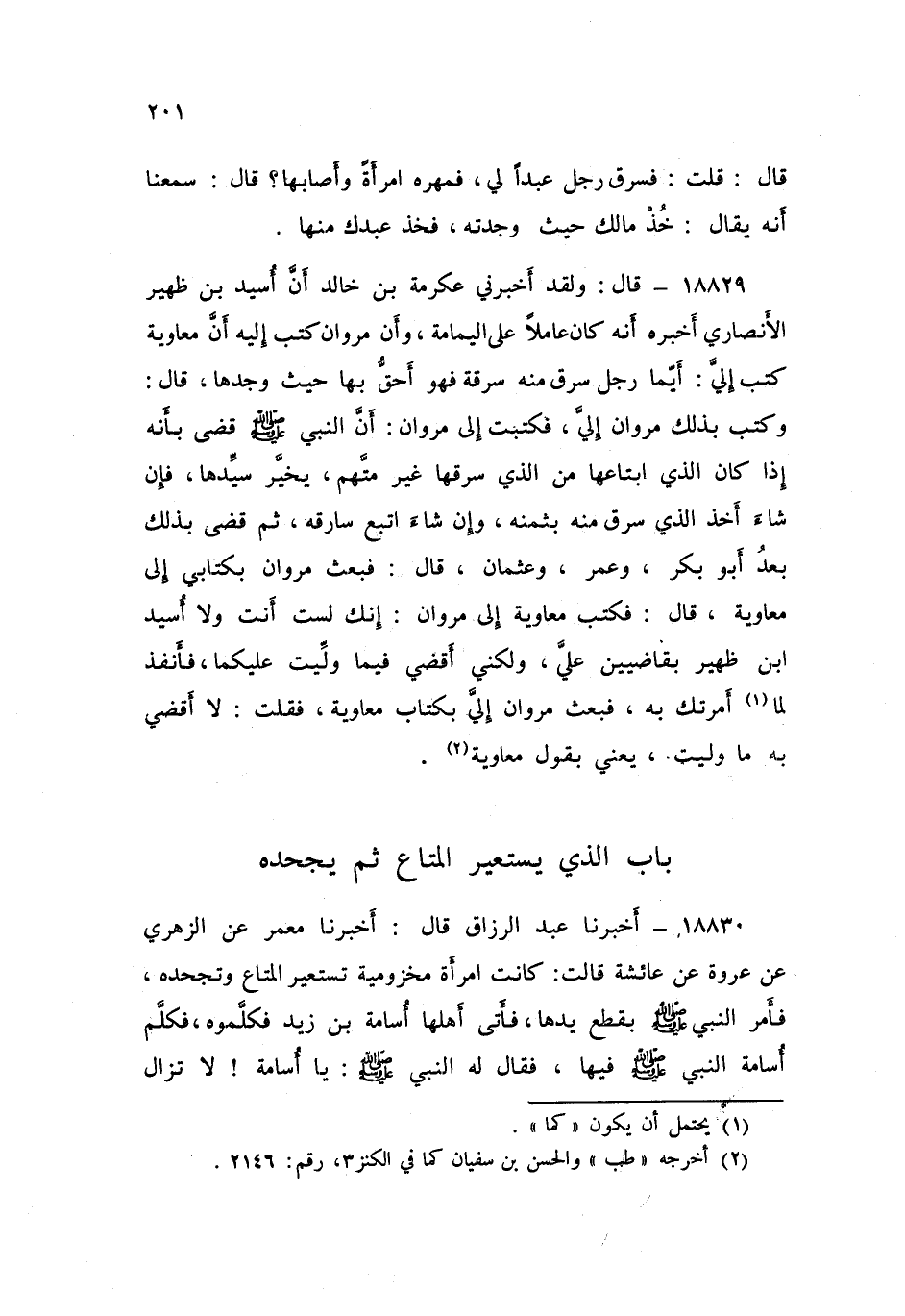 18829 - قَالَ: وَلَقَدْ أَخْبَرَنِي عِكْرِمَةُ بْنُ خَالِدٍ , أَنَّ أُسَيْدَ بْنَ ظُهَيْرٍ الْأَنْصَارِيَّ , أَخْبَرَهُ أَنَّهُ كَانَ عَامِلًا عَلَى الْيَمَامَةِ وَأَنَّ مَرْوَانَ كَتَبَ إِلَيْهِ أَنَّ مُعَاوِيَةَ كَتَبَ إِلَيَّ: أَيُّمَا رَجُلٍ سُرِقَ مِنْهُ سَرِقَةٌ , فَهُوَ أَحَقُّ بِهَا , حَيْثُ وَجَدَهَا , قَالَ: وَكَتَبَ بِذَلِكَ مَرْوَانُ إِلَيَّ فَكَتَبْتُ إِلَى مَرْوَانَ " أَنَّ النَّبِيَّ صَلَّى اللهُ عَلَيْهِ وَسَلَّمَ: §قَضَى بِأَنَّهُ إِذَا كَانَ الَّذِي ابْتَاعَهَا , مِنَ الَّذِي سَرَقَهَا غَيْرَ مُتَّهَمٍ , يُخَيِّرُ سَيِّدَهَا فَإِنْ شَاءَ أَخَذَ الَّذِي سُرِقَ مِنْهُ بِثَمَنِهِ , وَإِنْ شَاءَ اتَّبَعَ سَارِقَهُ " ثُمَّ قَضَى بِذَلِكَ بَعْدُ أَبُو بَكْرٍ وَعُمَرُ وَعُثْمَانُ قَالَ: فَبَعَثَ مَرْوَانُ بِكِتَابِي إِلَى مُعَاوِيَةَ قَالَ: فَكَتَبَ مُعَاوِيَةُ إِلَى مَرْوَانَ: «إِنَّكَ لَسْتَ أَنْتَ وَلَا أُسَيْدُ بْنُ ظُهَيْرٍ بِقَاضِيَيْنِ عَلَيَّ وَلَكِنِّي أَقْضِي فِيمَا وُلِّيتُ عَلَيْكُمَا , فَأَنْفِذْ لِمَا أَمَرْتُكَ بِهِ» , فَبَعَثَ مَرْوَانُ إِلَيَّ بِكِتَابِ مُعَاوِيَةَ فَقُلْتُ: لَا أَقْضِي بِهِ مَا وُلِّيتُ - يَعْنِي بِقَوْلِ مُعَاوِيَةَ -