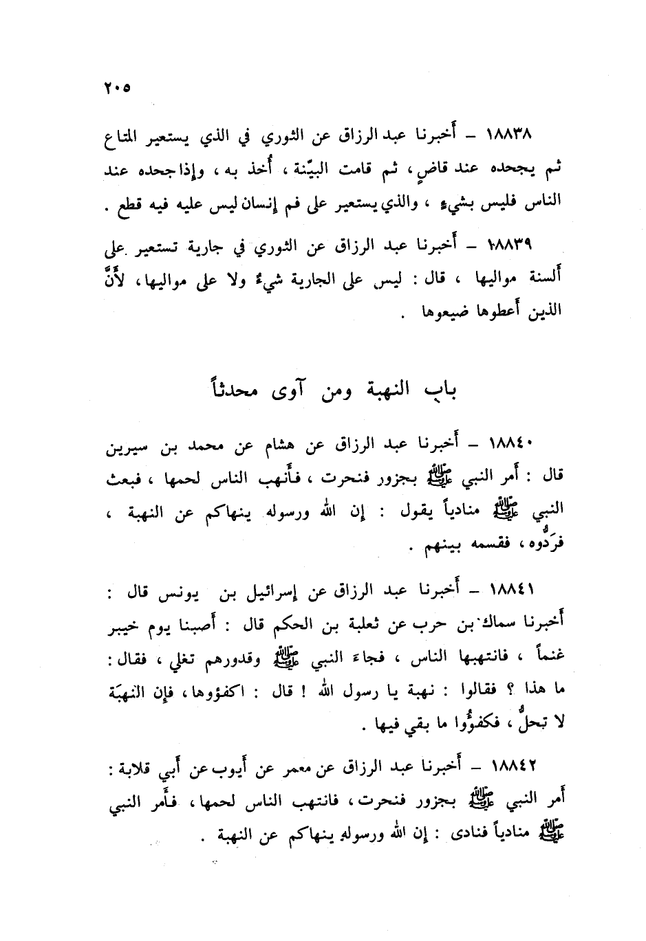 18841 - أَخْبَرَنَا عَبْدُ الرَّزَّاقِ، عَنْ إِسْرَائِيلَ بْنِ يُونُسَ , قَالَ: أَخْبَرَنَا سِمَاكُ بْنُ حَرْبٍ , عَنْ ثَعْلَبَةَ بْنِ الْحَكَمِ , قَالَ: أَصَبْنَا يَوْمَ خَيْبَرَ غَنَمًا فَانْتَهَبَهَا النَّاسُ فَجَاءَ النَّبِيُّ صَلَّى اللهُ عَلَيْهِ وَسَلَّمَ وَقُدُورُهُمْ تَغْلِي , فَقَالَ: مَا هَذَا؟ فَقَالُوا: نُهْبَةٌ يَا رَسُولَ اللَّهِ , قَالَ: «§أَكْفِئُوهَا فَإِنَّ النُّهْبَةَ لَا تَحِلُّ , فَكَفَئُوا مَا بَقِيَ فِيهَا»