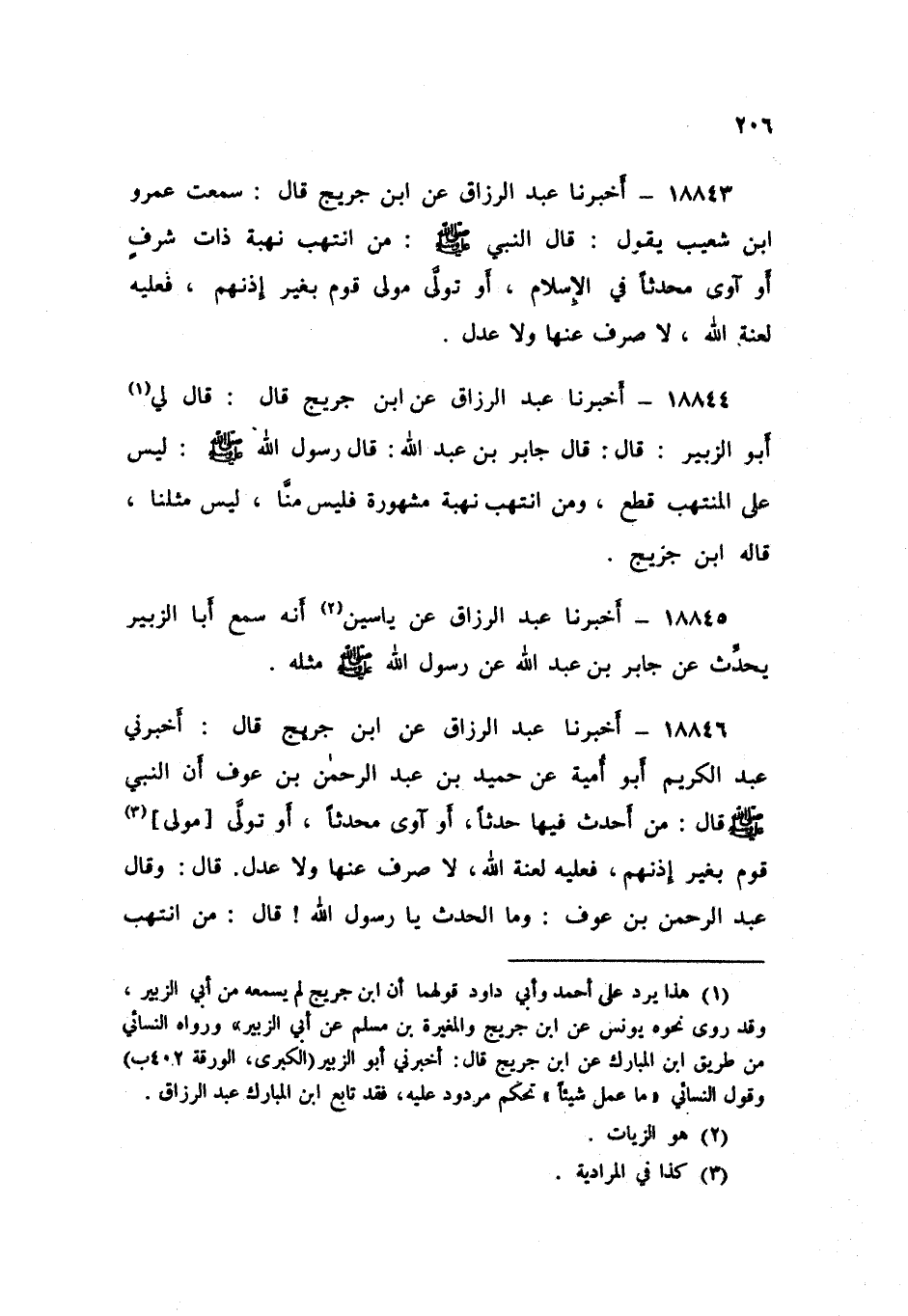 18846 - أَخْبَرَنَا عَبْدُ الرَّزَّاقِ، عَنِ ابْنِ جُرَيْجٍ , قَالَ: أَخْبَرَنِي عَبْدُ الْكَرِيمِ أَبُو أُمَيَّةَ , عَنْ حُمَيْدِ بْنِ عَبْدِ الرَّحْمَنِ بْنِ عَوْفٍ , أَنَّ النَّبِيَّ صَلَّى اللهُ عَلَيْهِ وَسَلَّمَ , قَالَ: «§مَنْ أَحْدَثَ فِيهَا حَدَثًا , أَوْ آوَى مُحْدِثًا , أَوْ تَوَلَّى مَوْلَى قَوْمٍ بِغَيْرِ إِذْنِهِمْ , فَعَلَيْهِ لَعْنَةُ اللَّهِ , لَا صَرْفَ عَنْهَا وَلَا عَدْلَ» قَالَ: وَقَالَ عَبْدُ الرَّحْمَنِ بْنُ عَوْفٍ وَمَا الْحَدَثُ يَا رَسُولَ اللَّهِ؟ قَالَ: «مَنِ انْتَهَبَ -[207]- نُهْبَةً يَرْفَعُ لَهَا النَّاسُ إِلَيْهِ أَبْصَارَهُمْ , أَوْ مَثَّلَ بِغَيْرِ حَدٍّ , أَوْ سَنَّ سُنَّةً لَمْ تَكُنْ» قُلْتُ لِعَبْدِ الْكَرِيمِ: قَوْلُهُ مَنْ أَحْدَثَ فِيهَا؟ قَالَ: مَكَّةَ الْحَرَامَ وَزَادَ آخَرُونَ , عَنِ النَّبِيِّ صَلَّى اللهُ عَلَيْهِ وَسَلَّمَ «أَوْ قَتَلَ بِغَيْرِ حَقٍّ»