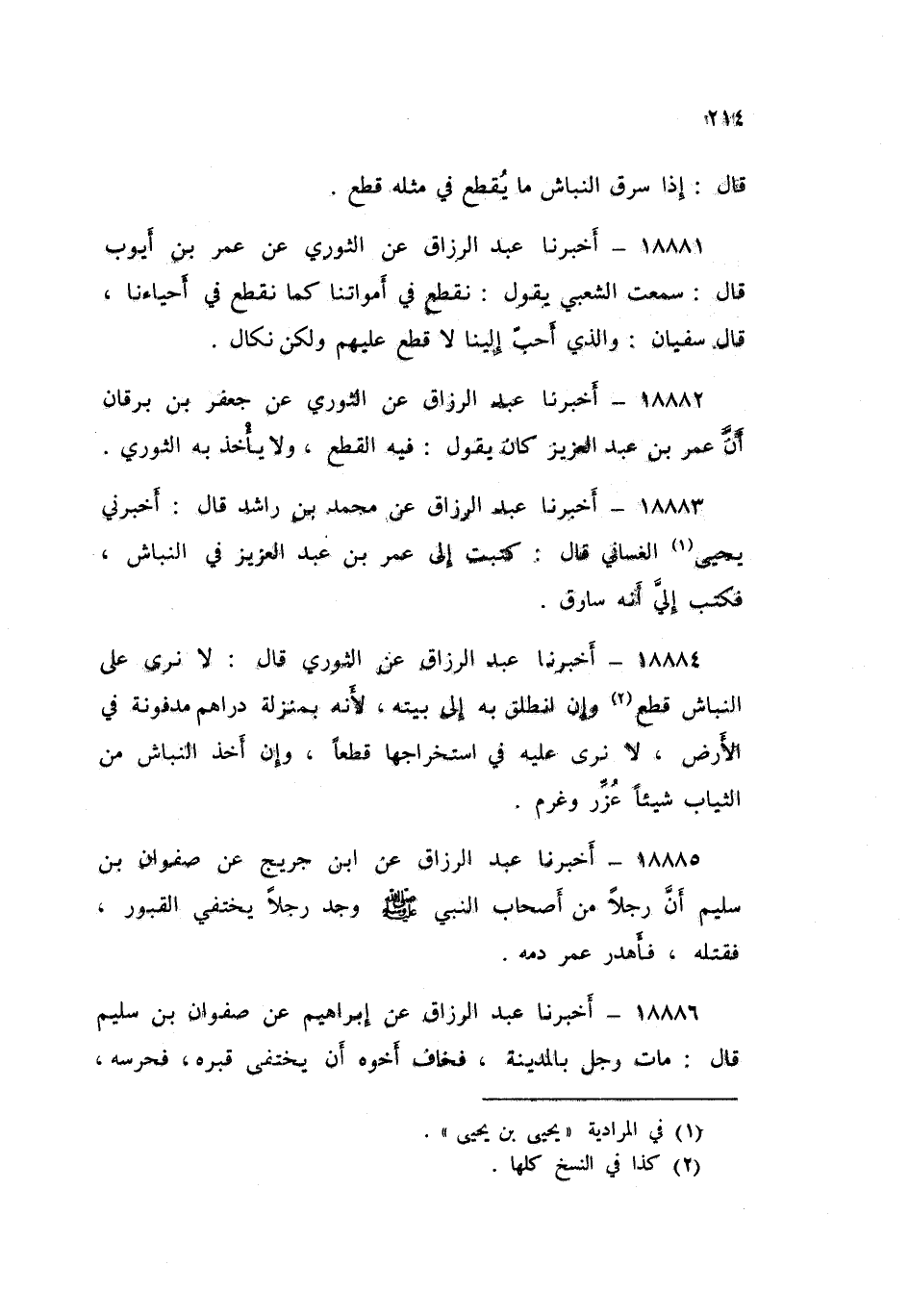 18883 - عَنْ مُحَمَّدِ بْنِ رَاشِدْ , قَالَ: أَخْبَرَنِي يَحْيَى الْغَسَّانِيُّ , قَالَ: كَتَبْتُ إِلَى عُمَرَ بْنِ عَبْدِ الْعَزِيزِ فِي النَّبَّاشِ «فَكَتَبَ إِلَيَّ §أَنَّهُ سَارِقٌ»