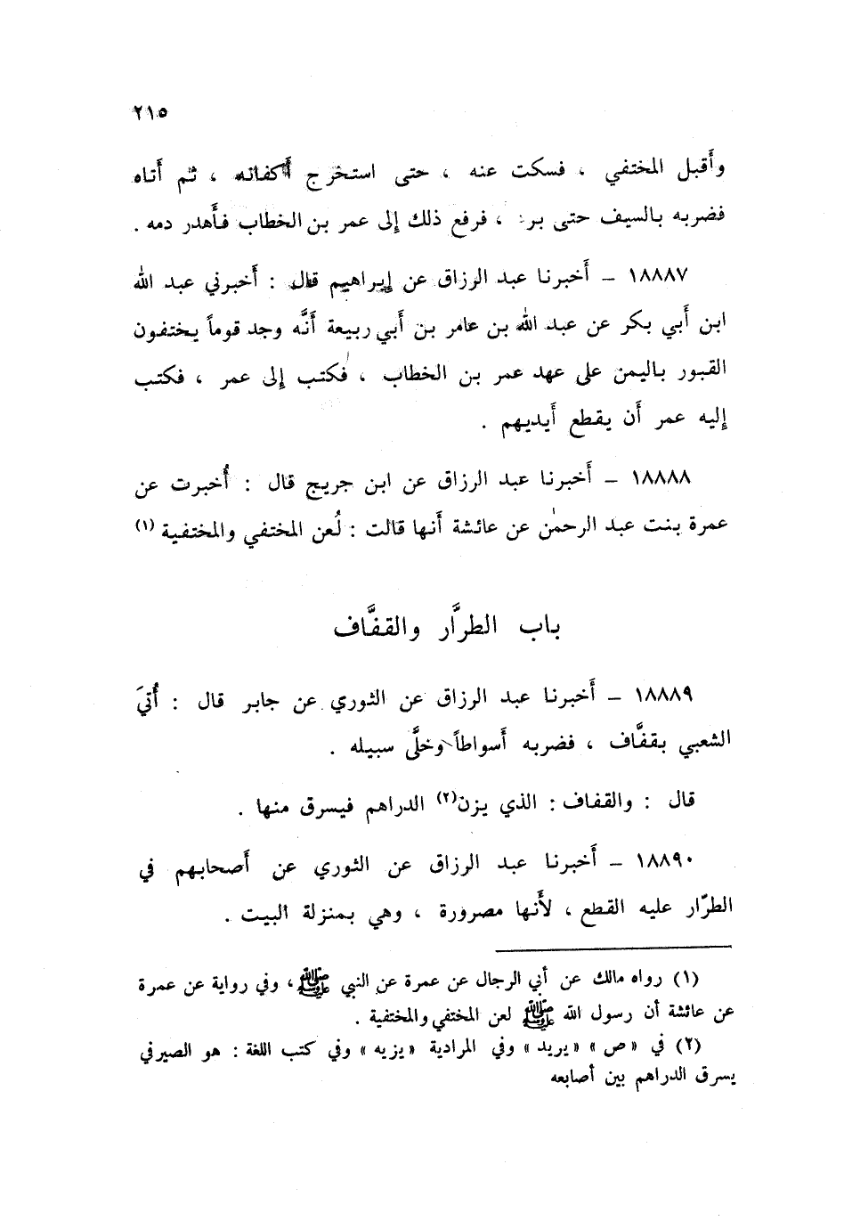 18887 - أَخْبَرَنَا عَبْدُ الرَّزَّاقِ، عَنْ إِبْرَاهِيمَ , قَالَ: أَخْبَرَنِي عَبْدُ اللَّهِ بْنُ أَبِي بَكْرٍ , عَنْ عَبْدِ اللَّهِ بْنِ عَامِرِ بْنِ رَبِيعَةَ أَنَّهُ وَجَدَ قَوْمًا يَخْتَفُونَ الْقُبُورَ بِالْيَمَنِ عَلَى عَهْدِ عُمَرَ بْنِ الْخَطَّابِ فَكَتَبَ إِلَى عُمَرَ «فَكَتَبَ إِلَيْهِ عُمَرُ أَنْ §يَقْطَعَ أَيْدِيَهُمْ»