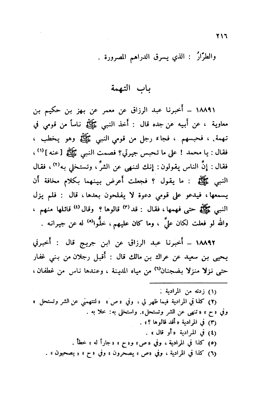 18891 - أَخْبَرَنَا عَبْدُ الرَّزَّاقِ، عَنْ مَعْمَرٍ , عَنْ بَهْزِ بْنِ حَكِيمِ بْنِ مُعَاوِيَةَ , عَنْ أَبِيهِ , عَنْ جَدِّهِ , قَالَ: أَخَذَ النَّبِيُّ صَلَّى اللهُ عَلَيْهِ وَسَلَّمَ نَاسًا مِنْ قَوْمِي فِي تُهْمَةٍ فَحَبَسَهُمْ , فَجَاءَ رَجُلٌ مِنْ قَوْمِي النَّبِيَّ صَلَّى اللهُ عَلَيْهِ وَسَلَّمَ وَهُوَ يَخْطُبُ فَقَالَ: يَا مُحَمَّدُ عَلَى مَا تَحْبِسُ جِيرَتِي؟ فَصَمَتَ النَّبِيُّ صَلَّى اللهُ عَلَيْهِ وَسَلَّمَ عَنْهُ فَقَالَ: إِنَّ النَّاسَ يَقُولُونَ إِنَّكَ لَتَنْهَى عَنِ الشَّرِّ وَتَسْتَخْلِي بِهِ , فَقَالَ النَّبِيُّ صَلَّى اللهُ عَلَيْهِ وَسَلَّمَ: «§مَا يَقُولُ؟» فَجَعَلْتُ أَعْرِضُ بَيْنَهُمَا بِكَلَامٍ مَخَافَةَ أَنْ يَسْمَعَهَا , فَيَدْعُو عَلَى قَوْمِي دَعْوَةً لَا يُفْلِحُونَ بَعْدَهَا قَالَ: فَلَمْ يَزَلِ النَّبِيُّ صَلَّى اللهُ عَلَيْهِ وَسَلَّمَ حَتَّى فَهِمَهَا فَقَالَ: «قَدْ قَالُوهَا؟» وَقَالَ قَائِلُهَا مِنْهُمْ وَاللَّهِ لَوْ فَعَلْتُ لَكَانَ عَلَيَّ , وَمَا كَانَ عَلَيْهِمْ، خَلُّوا لَهُ عَنْ جِيرَانِهِ