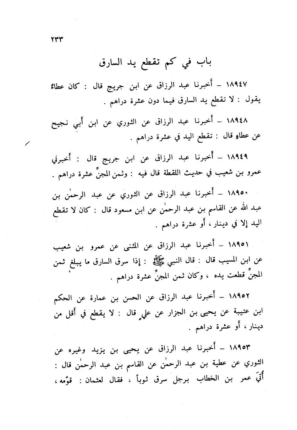 18948 - أَخْبَرَنَا عَبْدُ الرَّزَّاقِ، عَنِ الثَّوْرِيِّ , عَنِ ابْنِ أَبِي نَجِيحٍ , عَنْ عَطَاءٍ , قَالَ: «§تُقْطَعُ الْيَدُ فِي عَشَرَةِ دَرَاهِمَ»