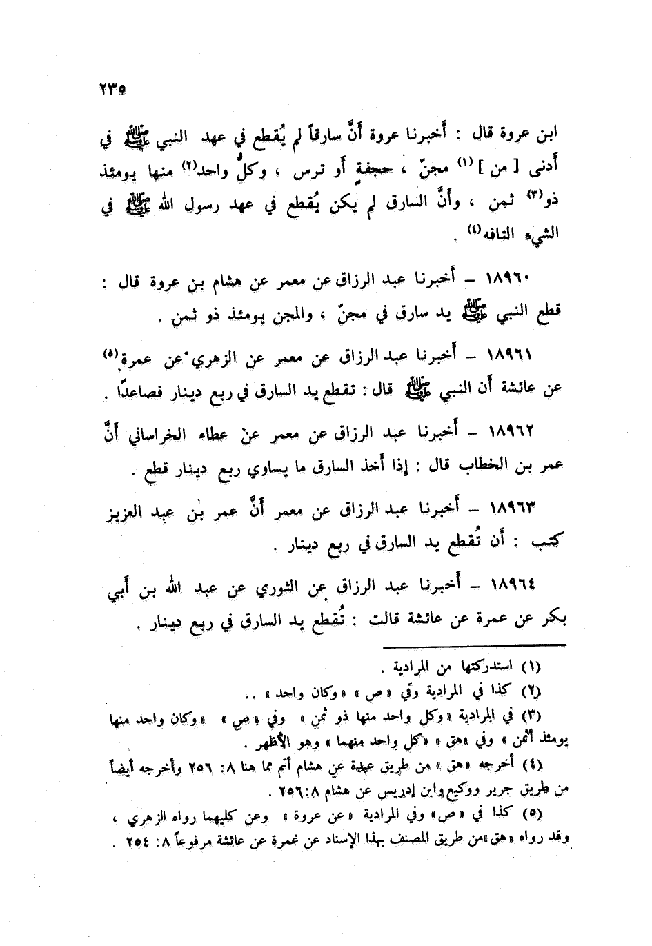 18961 - أَخْبَرَنَا عَبْدُ الرَّزَّاقِ، عَنْ مَعْمَرٍ , عَنِ الزُّهْرِيِّ , عَنْ عَمْرَةَ , عَنْ عَائِشَةَ , أَنَّ النَّبِيَّ صَلَّى اللهُ عَلَيْهِ وَسَلَّمَ قَالَ: «§تُقْطَعُ يَدُ السَّارِقِ فِي رُبُعِ دِينَارٍ فَصَاعِدًا»