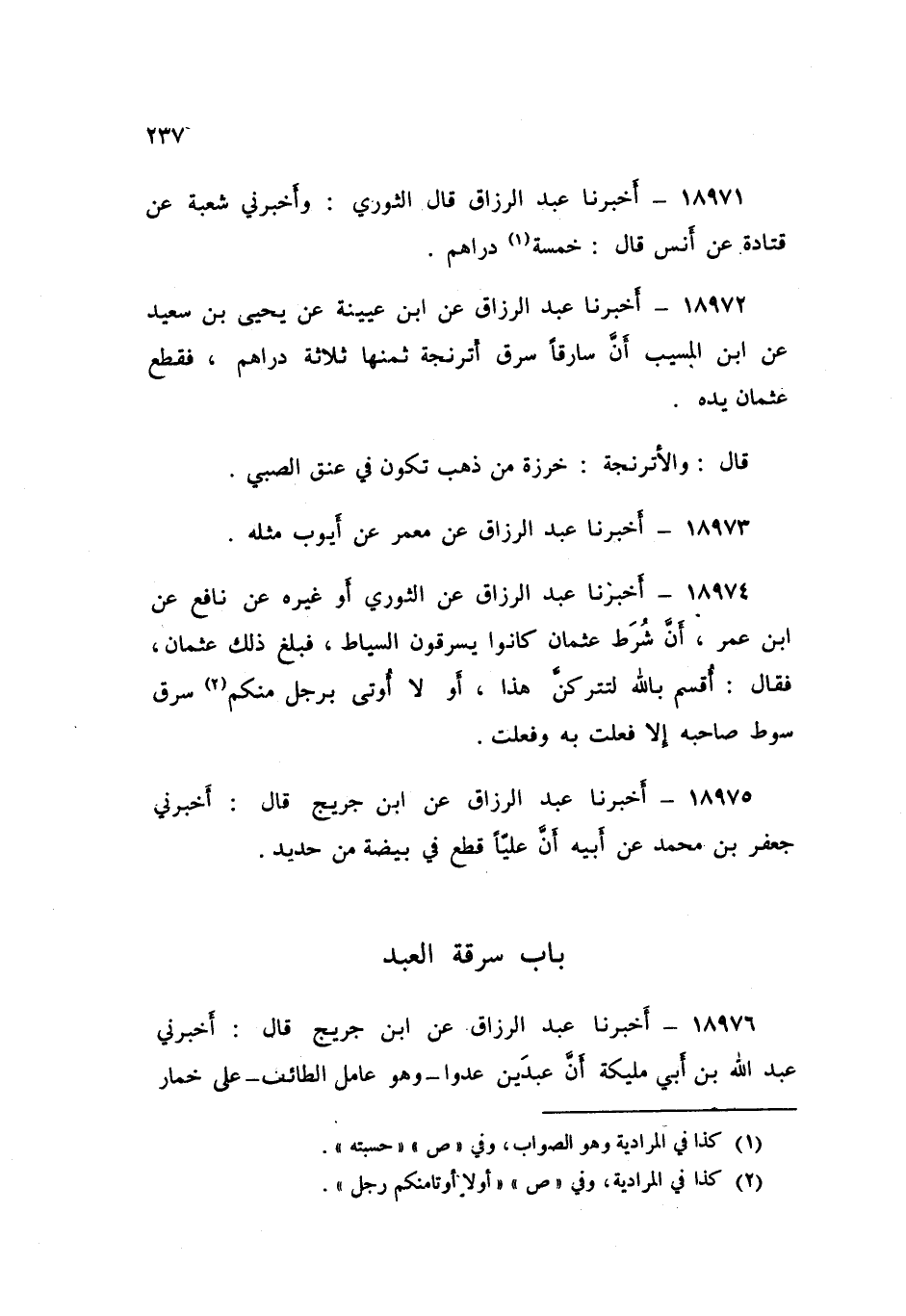 18972 - أَخْبَرَنَا عَبْدُ الرَّزَّاقِ، عَنِ ابْنِ عُيَيْنَةَ , عَنْ يَحْيَى بْنِ سَعِيدٍ , عَنِ ابْنِ الْمُسَيِّبِ , " أَنَّ سَارِقًا §سَرَقَ أُتْرُنْجَةً ثَمَنُهَا ثَلَاثَةُ دَرَاهِمَ: فَقَطَعَ عُثْمَانُ يَدَهُ " قَالَ: " وَالْأُتْرُنْجَةُ: خَرَزَةٌ مِنْ ذَهَبٍ تَكُونُ فِي عُنُقِ الصَّبِيِّ "،
