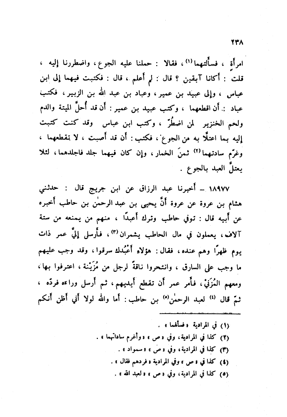 18977 - أَخْبَرَنَا عَبْدُ الرَّزَّاقِ، عَنِ ابْنِ جُرَيْجٍ , قَالَ: حَدَّثَنِي هِشَامُ بْنُ عُرْوَةَ , عَنْ عُرْوَةَ , أَنَّ يَحْيَى بْنَ عَبْدِ الرَّحْمَنِ بْنِ حَاطِبٍ , أَخْبَرَهُ عَنْ أَبِيهِ , قَالَ: تُوُفِّيَ حَاطِبٌ وَتَرَكَ أَعْبُدًا , مِنْهُمْ مَنْ يَمْنَعُهُ , مِنْ سِتَّةِ آلَافٍ يَعْمَلُونَ فِي مَالِ الْحَاطِبِ , يُشَمِّرَانِ فَأَرْسَلَ إِلَيَّ عُمَرُ ذَاتَ يَوْمٍ ظُهْرًا , وَهُمْ عِنْدَهُ , فَقَالَ: هَؤُلَاءِ أَعْبُدُكَ سَرَقُوا وَقَدَ وَجَبَ عَلَيْهِمْ مَا وَجَبَ عَلَى السَّارِقِ، وَانْتَحَرُوا نَاقَةً لِرَجُلٍ مِنْ مُزَيْنَةَ اعْتَرَفُوا بِهَا وَمَعَهُمُ الْمُزَنِيُّ «فَأَمَرَ عُمَرُ أَنْ تُقْطَعَ أَيْدِيهِمْ» ثُمَّ أَرْسَلَ وَرَاءَهُ , فَرَدَّهُ , ثُمَّ قَالَ لِعَبْدِ الرَّحْمَنِ بْنِ حَاطِبٍ: «أَمَا وَاللَّهِ لَوْلَا أَنِّي §أَظُنُّ أَنَّكُمْ -[239]- تَسْتَعْمِلُونَهُمْ , وَتُجِيعُونَهُمْ , حَتَّى لَوْ أَنَّ أَحَدَهُمْ يَجِدُ مَا حَرَّمَ اللَّهُ عَلَيْهِ لَأَكَلَهُ , لَقَطَعْتُ أَيْدِيَهُمْ , وَلَكِنْ وَاللَّهُ إِذْ تَرَكْتُهُمْ لَأُغَرِّمَنَّكَ غَرَامَةُ تُوجِعُكَ» , ثُمَّ قَالَ لِلْمُزَنِيِّ: كَمْ ثَمَنُهَا؟ قَالَ: «كُنْتُ أَمْنَعُهَا مِنْ أَرْبَعِ مِائَةٍ» قَالَ: أَعْطِهِ ثَمَانِ مِائَةٍ