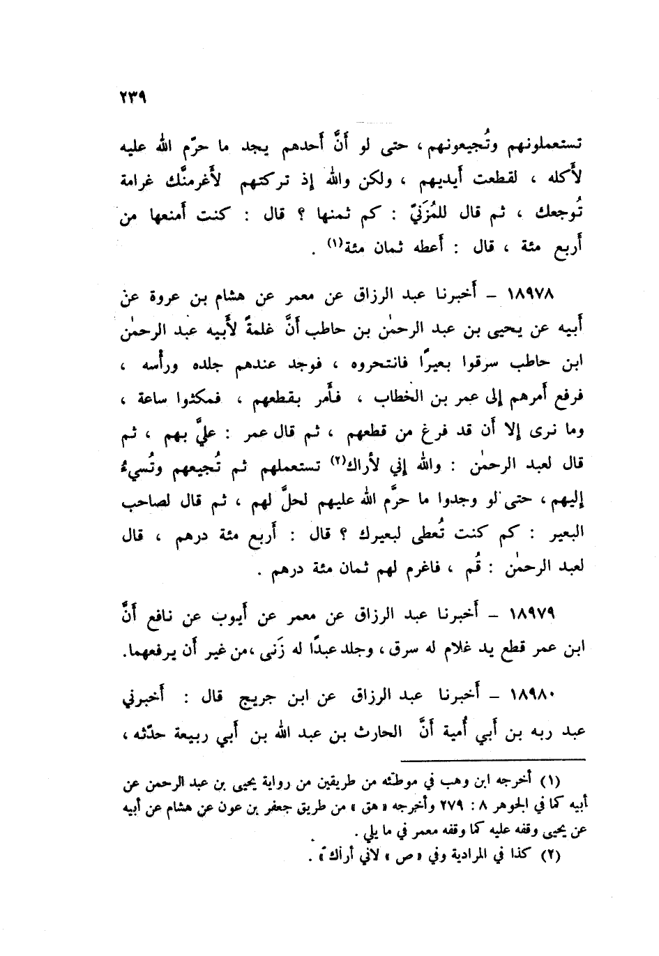 18978 - أَخْبَرَنَا عَبْدُ الرَّزَّاقِ، عَنْ مَعْمَرٍ , عَنْ هِشَامِ بْنِ عُرْوَةَ , عَنْ أَبِيهِ , عَنْ يَحْيَى بْنِ عَبْدِ الرَّحْمَنِ بْنِ حَاطِبٍ , أَنَّ غِلْمَةً , لِأَبِيهِ عَبْدِ الرَّحْمَنِ بْنِ حَاطِبٍ سَرَقُوا بَعِيرًا , فَانْتَحَرُوهُ , فَوُجِدَ عِنْدَهُمْ جِلْدُهُ , وَرَأْسُهُ , فَرُفِعَ أَمْرُهُمْ إِلَى عُمَرَ بْنِ الْخَطَّابِ «فَأَمَرَ بِقَطْعِهِمْ» , فَمَكَثُوا سَاعَةً , وَمَا نُرَى إِلَّا أَنْ قَدْ فَرَغَ مِنْ قَطْعِهِمْ , ثُمَّ قَالَ عُمَرُ: «عَلَيَّ بِهِمْ» , ثُمَّ قَالَ لِعَبْدِ الرَّحْمَنِ: «وَاللَّهُ , إِنِّي لَأَرَاكَ §تَسْتَعْمِلُهُمْ , ثُمَّ تُجِيعُهُمْ , وَتُسِيءُ إِلَيْهِمْ , حَتَّى لَوْ وَجَدُوا مَا حَرَّمَ اللَّهُ عَلَيْهِمْ , لَحَلَّ لَهُمْ» , ثُمَّ قَالَ لِصَاحِبِ الْبَعِيرِ: «كَمْ كُنْتَ تُعْطَى لِبَعِيرِكَ؟» قَالَ: أَرْبَعَ مِائَةِ دِرْهَمٍ , قَالَ لِعَبْدِ الرَّحْمَنِ: «قُمْ فَاغْرَمْ لَهُمْ ثَمَانِ مِائَةِ دِرْهَمْ»