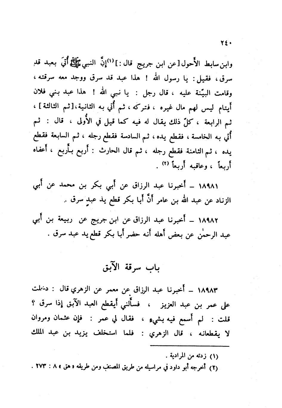 18981 - أَخْبَرَنَا عَبْدُ الرَّزَّاقِ، عَنْ أَبِي بَكْرِ بْنِ مُحَمَّدٍ , عَنْ أَبِي الزِّنَادِ , عَنْ عَبْدِ اللَّهِ بْنِ عَامِرٍ , أَنَّ أَبَا بَكْرٍ: «§قَطَعَ يَدَ عَبْدٍ سَرَقَ»