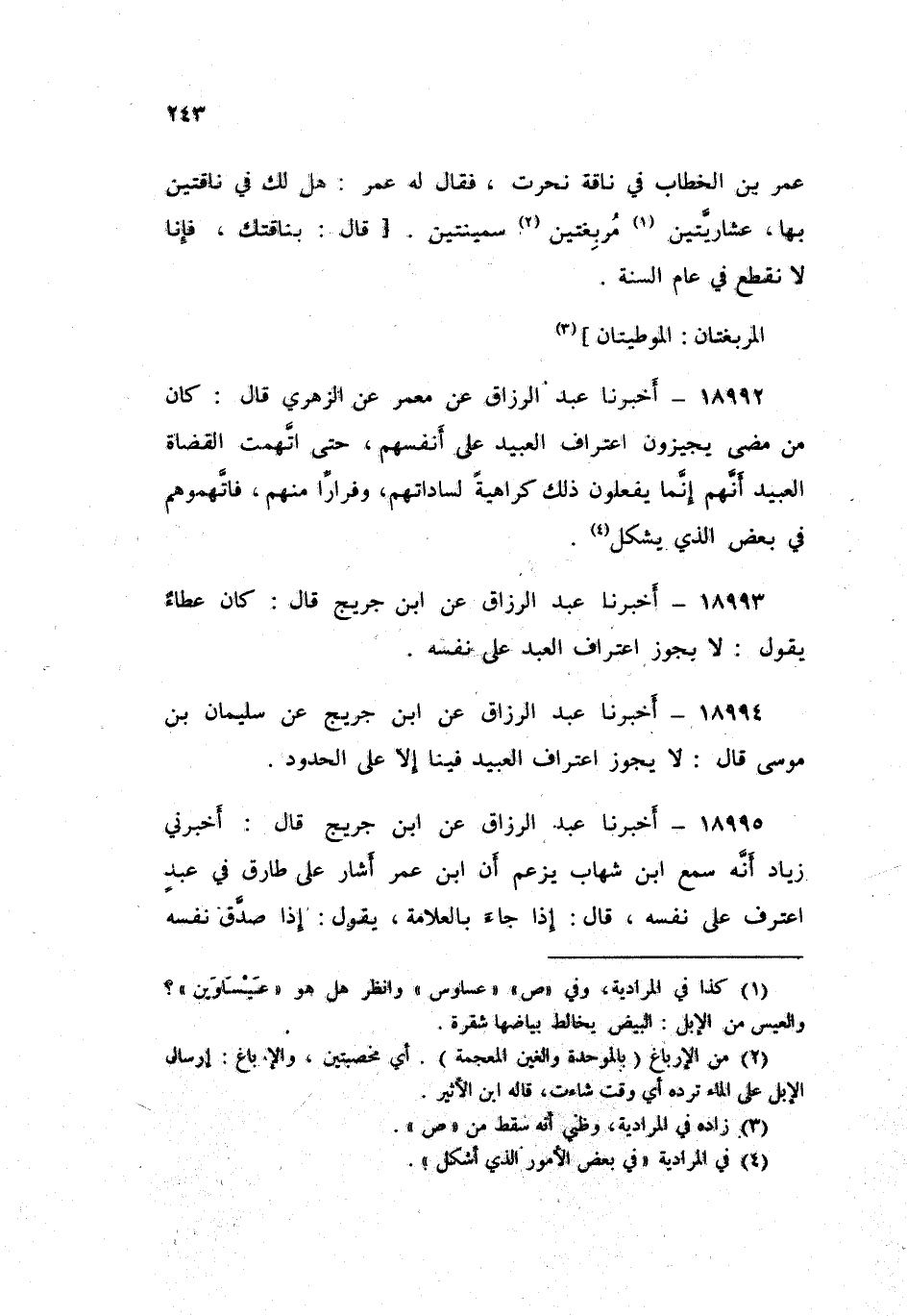 18994 - أَخْبَرَنَا عَبْدُ الرَّزَّاقِ، عَنِ ابْنِ جُرَيْجٍ , عَنْ سُلَيْمَانَ بْنِ مُوسَى , قَالَ: «§لَا يَجُوزُ اعْتِرَافُ الْعَبِيدِ فِينَا , إِلَّا عَلَى الْحُدُودِ»