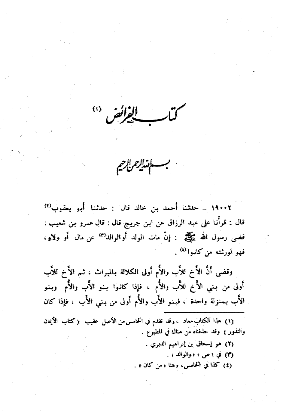 19002 - حَدَّثَنَا أَحْمَدُ بْنُ خَالِدٍ , قَالَ: حَدَّثَنَا أَبُو يَعْقُوبَ , عَنِ ابْنِ جُرَيْجٍ , قَالَ: قَالَ عَمْرُو بْنُ شُعَيْبٍ: «قَضَى رَسُولُ اللَّهِ صَلَّى اللهُ عَلَيْهِ وَسَلَّمَ , §إِنْ مَاتَ الْوَلَدُ أَوِ الْوَالِدُ عَنْ مَالٍ أَوْ وَلَاءٍ فَهُوَ لِوَرَثَتِهِ مَنْ كَانُوا , وَقَضَى أَنَّ الْأَخَ لِلْأَبِ وَالْأُمَّ أَوْلَى الْكَلَالَةِ بِالْمِيرَاثِ , ثُمَّ الْأَخَ لِلْأَبِ أَوْلَى مِنْ بَنِي الْأَخِ لِلْأَبِ وَالْأُمِّ , فَإِذَا كَانُوا بَنُو الْأَبِ وَالْأُمِّ , وَبَنُو الْأَبِ بِمَنْزِلَةٍ وَاحِدَةٍ , فَبَنُو الْأَبِ وَالْأُمِّ أَوْلَى مِنْ بَنِي الْأَبِ , فَإِذَا كَانَ -[248]- بَنُو الْأَبِ أَرْفَعَ مِنْ بَنِي الْأُمِّ وَالْأَبِ بِأَبٍ فَبَنُو الْأَبِ أَوْلَى , وَإِذَا اسْتَوَوْا فِي النَّسَبِ , فَبَنُو الْأَبِ وَالْأُمِّ أَوْلَى مِنْ بَنِي الْأَبِ , وَقَضَى أَنَّ الْعَمَّ لِلْأَبِ وَالْأُمِّ أَوْلَى مِنَ الْعَمِّ لِلْأَبِ , وَأَنَّ الْعَمَّ لِلْأَبِ أَوْلَى مِنْ بَنِي الْعَمِّ لِلْأَبِ وَالْأُمِّ , فَإِذَا كَانُوا بَنُو الْأَبِ وَالْأُمِّ وَبَنُو الْأَبِ بِمَنْزِلَةٍ وَاحِدَةٍ نَسَبًا وَاحِدًا فَبَنُو الْأَبِ وَالْأُمِّ أَوْلَى مِنْ بَنِي الْأَبِ , فَإِذَا اسْتَوَوْا فِي النَّسَبِ , فَبَنُو الْأَبِ وَالْأُمِّ أَوْلَى مِنْ بَنِي الْأَبِ , لَا يَرِثُ عَمٌّ وَلَا ابْنُ عَمٍّ , مَعَ أَخٍ وَابْنِ أَخِ , الْأَخِ وَابْنُ الْأَخِ مَا كَانَ مِنْهُمْ أَحَدٌ أَوْلَى بِالْمِيرَاثِ , مَا كَانُوا مِنَ الْعَمِّ وَابْنِ الْعَمِّ , وَقَضَى أَنَّهُ مَنْ كَانَتْ لَهُ عَصَبَةٌ , مِنَ الْمُحَرَّرِينَ , فَلَهُمْ مِيرَاثُهُمْ عَلَى فَرَائِضِهِمْ فِي كِتَابِ اللَّهِ , مَا لَمْ تَسْتَوْعِبْ فَرَائِضُهُمْ مَالَهُ كُلَّهُ , رُدَّ عَلَيْهِمْ مَا بَقِي مِنْ مِيرَاثِهِ عَلَى فَرَائِضِهِمْ , حَتَّى يَرِثُوا مَالَهُ كُلَّهُ , وَقَضَى أَنَّ الْكَافِرَ لَا يَرِثُ الْمُسْلِمَ , وَإِنْ لَمْ يَكُنْ لَهُ وَارِثٌ غَيْرُهُ , وَأَنَّ الْمُسْلِمَ لَا يَرِثُ الْكَافِرَ , مَا كَانَ لَهُ وَارِثٌ يَرِثُهُ أَوْ قَرَابَةٌ بِهِ , فَإِنْ لَمْ يَكُنْ لَهُ وَارِثٌ يَرِثُهُ أَوْ قَرَابَةٌ بِهِ وَرِثَهُ الْمُسْلِمُ بِالْإِسْلَامِ , وَقَضَى أَنَّ كُلَّ مَالْ قُسِمَ فِي الْجَاهِلِيَّةِ , فَهُوَ عَلَى قِسْمَةِ الْجَاهِلِيَّةِ , وَأَنَّ مَا أَدْرَكَ الْإِسْلَامُ وَلَمْ يُقْسَمْ فَهُوَ عَلَى قِسْمَةِ الْإِسْلَامِ»