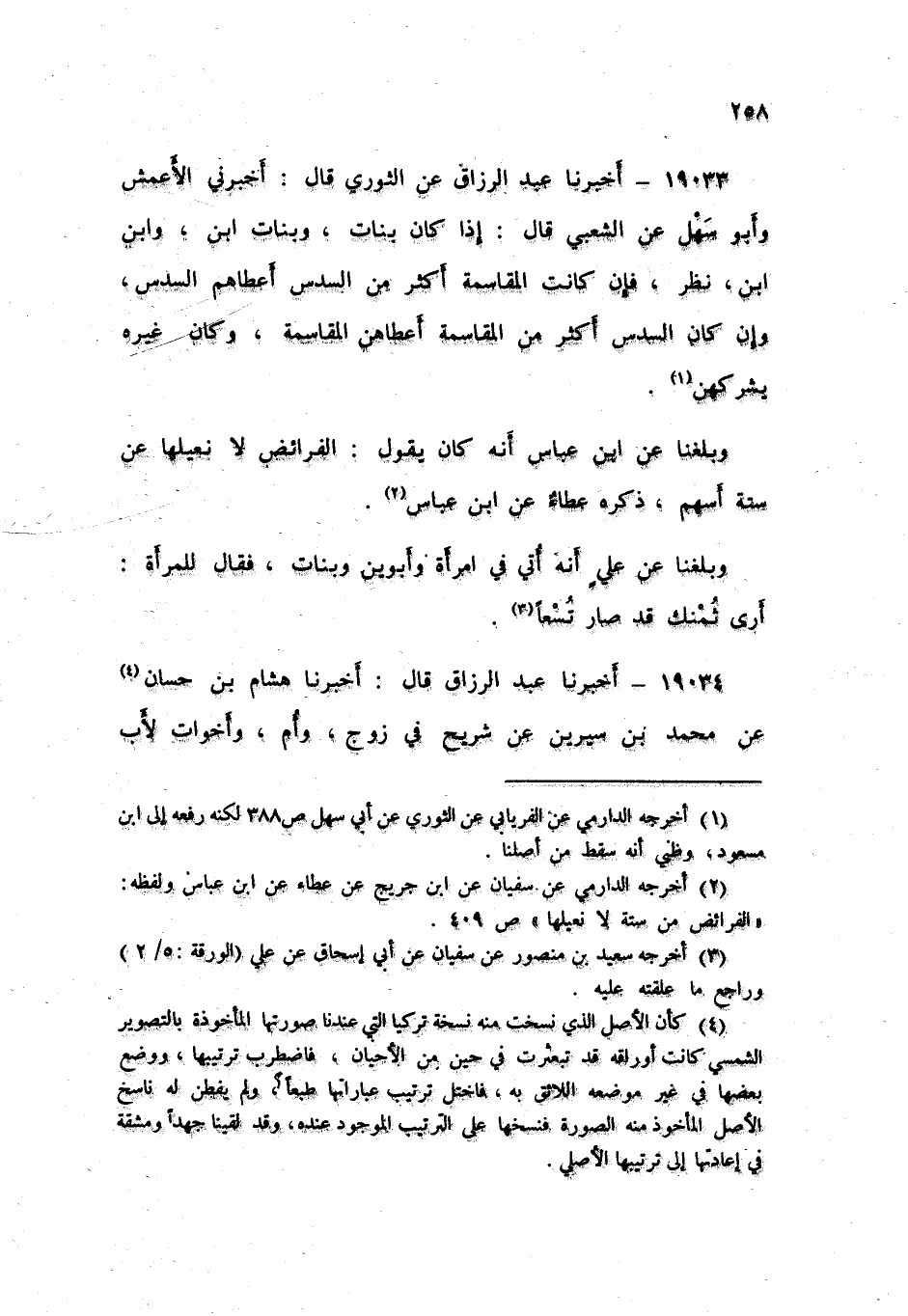19033 - أَخْبَرَنَا عَبْدُ الرَّزَّاقِ، عَنِ الثَّوْرِيِّ , قَالَ: أَخْبَرَنِي الْأَعْمَشُ , وَأَبُو سَهْلٍ , عَنِ الشَّعْبِيِّ , قَالَ: «§إِذَا كَانَ بَنَاتٌ وَبَنَاتُ ابْنٍ وَابْنُ ابْنٍ نُظِرَ , فَإِنْ كَانَتِ الْمُقَاسَمَةُ أَكْثَرَ مِنَ السُّدُسِ , أَعْطَاهُمُ السُّدُسَ , وَإِنْ كَانَ السُّدُسُ أَكْثَرَ مِنَ الْمُقَاسَمَةِ أَعْطَاهُنَّ الْمُقَاسَمَةَ» وَكَانَ غَيْرُهُ: «يُشْرِكُهُنَّ» وَبَلَغَنَا عَنِ ابْنِ عَبَّاسٍ أَنَّهُ كَانَ يَقُولُ: «الْفَرَائِضُ لَا نُعِيلُهَا عَنْ سِتَّةِ أَسْهُمٍ» ذَكَرَهُ عَطَاءٌ , عَنِ ابْنِ عَبَّاسٍ , وَبَلَغَنَا عَنْ عَلِيٍّ أَنَّهُ أُتِيَ فِي امْرَأَةٍ وَأَبَوَيْنِ وَبَنَاتٍ، فَقَالَ لِلْمَرْأَةِ: «أَرَى ثُمْنَكِ قَدْ صَارَ تُسْعًا»