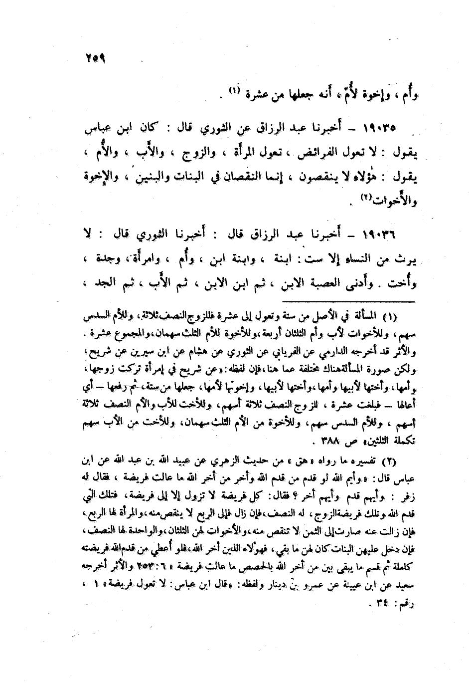 19035 - أَخْبَرَنَا عَبْدُ الرَّزَّاقِ، عَنِ الثَّوْرِيِّ , قَالَ: كَانَ ابْنُ عَبَّاسٍ يَقُولُ: «§لَا تُعَوَّلُ الْفَرَائِضُ , تُعَوَّلُ الْمَرْأَةُ , وَالزَّوْجُ , وَالْأَبُ , وَالْأُمُّ» يَقُولُ: «هَؤُلَاءِ لَا يَنْقُصُونَ , إِنَّمَا النُّقْصَانُ فِي الْبَنَاتِ وَالْبَنِينَ , وَالْإِخْوَةِ وَالْأَخَوَاتِ»