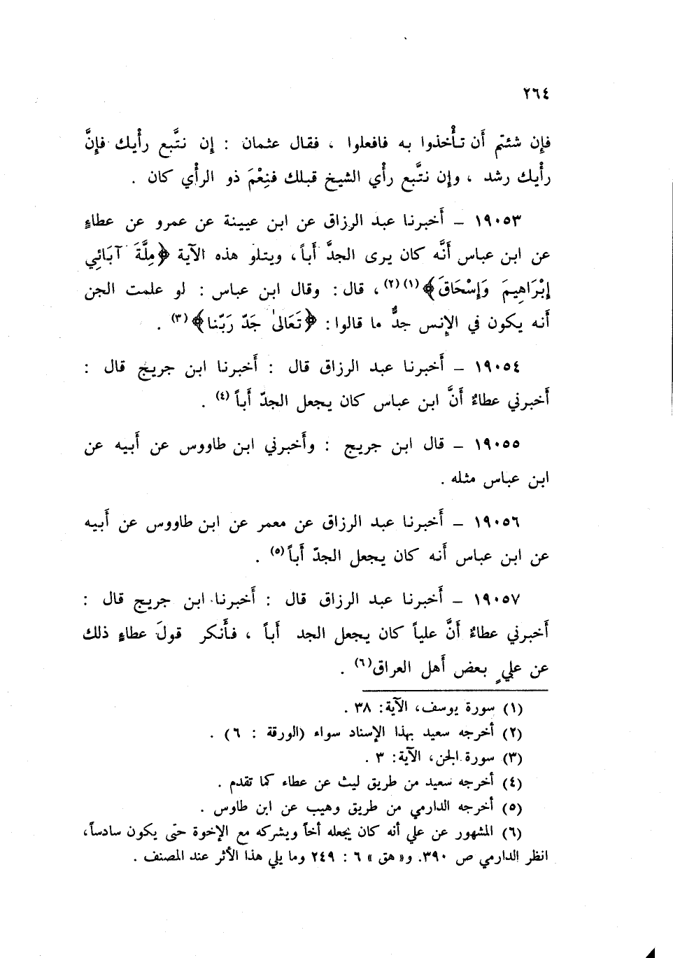 19053 - أَخْبَرَنَا عَبْدُ الرَّزَّاقِ، عَنِ ابْنِ عُيَيْنَةَ , عَنْ عَمْرٍو , عَنْ عَطَاءٍ , عَنِ ابْنِ عَبَّاسٍ «أَنَّهُ كَانَ §يَرَى الْجَدَّ أَبًا» وَيَتْلُو هَذِهِ الْآيَةَ: {مِلَّةَ آبَائِي إِبْرَاهِيمَ وَإِسْحَاقَ} قَالَ: وَقَالَ ابْنُ عَبَّاسٍ: «لَوْ عَلِمَتِ الْجِنُّ أَنَّهُ يَكُونُ فِي الْإِنْسِ جَدٌّ» مَا قَالُوا: {تَعَالَى جَدُّ رَبِّنَا} [الجن: 3]