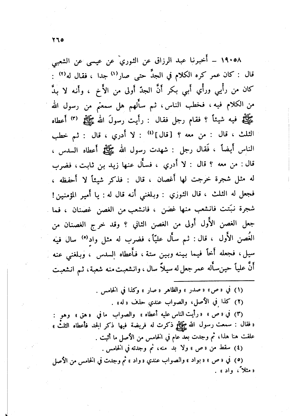 19058 - أَخْبَرَنَا عَبْدُ الرَّزَّاقِ، عَنِ الثَّوْرِيِّ , عَنْ عِيسَى , عَنِ الشَّعْبِيِّ , قَالَ: كَانَ عُمَرُ كَرِهَ الْكَلَامَ فِي الْجَدِّ حَتَّى صَارَ جَدًّا فَقَالَ لَهُ: كَانَ مِنْ رَأْيِي , وَرَأْيِ أَبِي بَكْرٍ أَنَّ الْجَدَّ أَوْلَى مِنَ الْأَخِ , وَأَنَّهُ لَا بُدَّ مِنَ الْكَلَامِ فِيهِ , فَخَطَبَ النَّاسَ , ثُمَّ سَأَلَهُمْ هَلْ سَمِعْتُمْ مِنْ رَسُولِ اللَّهِ صَلَّى اللهُ عَلَيْهِ وَسَلَّمَ فِيهِ شَيْئًا؟ فَقَامَ رَجُلٌ فَقَالَ: رَأَيْتُ رَسُولَ اللَّهِ صَلَّى اللهُ عَلَيْهِ وَسَلَّمَ: «§أَعْطَاهُ الثُّلُثَ» , قَالَ: مَنْ مَعَهُ؟ قَالَ: لَا أَدْرِي , قَالَ: ثُمَّ خَطَبَ النَّاسَ أَيْضًا , فَقَالَ رَجُلٌ: «شَهِدْتُ رَسُولَ اللَّهِ صَلَّى اللهُ عَلَيْهِ وَسَلَّمَ أَعْطَاهُ السُّدُسَ» , قَالَ: مَنْ مَعَهُ؟ قَالَ: لَا أَدْرِي فَسَأَلَ عَنْهَا زَيْدَ بْنَ ثَابِتٍ , فَضَرَبَ لَهُ مَثَلَ شَجَرَةٍ خَرَجَتْ لَهَا أَغْصَانٌ , قَالَ: فَذَكَرَ شَيْئًا لَا أَحْفَظُهُ , «فَجَعَلَ لَهُ الثُّلُثَ» , قَالَ الثَّوْرِيُّ: وَبَلَغَنِي أَنَّهُ قَالَ لَهُ: «يَا أَمِيرَ الْمُؤْمِنِينَ شَجَرَةٌ نَبَتَتْ فَانْشَعَبَ مِنْهَا غُصْنٌ , فَانْشَعَبَ مِنَ الْغُصْنِ غُصْنَانِ , فَمَا جَعَلَ الْغُصْنَ الْأَوَّلَ أَوْلَى مِنَ الْغُصْنِ الثَّانِي؟ وَقَدْ خَرَجَ الْغُصْنَانِ مِنَ الْغُصْنِ الْأَوَّلِ» قَالَ: ثُمَّ سَأَلَ عَلِيًّا فَضَرَبَ لَهُ مَثَلَ وَادٍ سَالَ فِيهِ سَيْلٌ , فَجَعَلَهُ أَخًا فِيمَا بَيْنَهُ وَبَيْنَ سِتَّةٍ , «فَأَعْطَاهُ السُّدُسَ» , وَبَلَغَنِي عَنْهُ أَنَّ عَلِيًّا حِينَ سَأَلَهُ عُمَرُ جَعَلَ لَهُ سَيْلًا سَالَ , وَانْشَعَبَتْ مِنْهُ شُعْبَةٌ , ثُمَّ انْشَعَبَتْ -[266]- شُعْبَتَانِ , فَقَالَ: «أَرَأَيْتَ لَوْ أَنَّ مَاءَ هَذِهِ الشُّعْبَةِ الْوُسْطَى يَبِسَ أَكَانَ يَرْجِعُ إِلَى الشُّعْبَتَيْنِ جَمِيعًا؟» قَالَ الشَّعْبِيُّ: فَكَانَ زَيْدٌ يَجْعَلُهُ أَخًا حَتَّى يَبْلُغَ ثَلَاثَةً هُوَ ثَالِثُهُمْ , فَإِنْ زَادُوا عَلَى ذَلِكَ أَعْطَاهُ الثُّلُثَ وَكَانَ عَلِيٌّ يَجْعَلُهُ أَخًا مَا بَيْنَهُ وَبَيْنَ سِتَّةٍ هُوَ سَادِسُهُمْ , يُعْطِيهِ السُّدُسَ , فَإِنْ زَادُوا عَلَى سِتَّةٍ أَعْطَاهُ السُّدُسَ , وَصَارَ مَا بَقِيَ بَيْنَهُمْ "