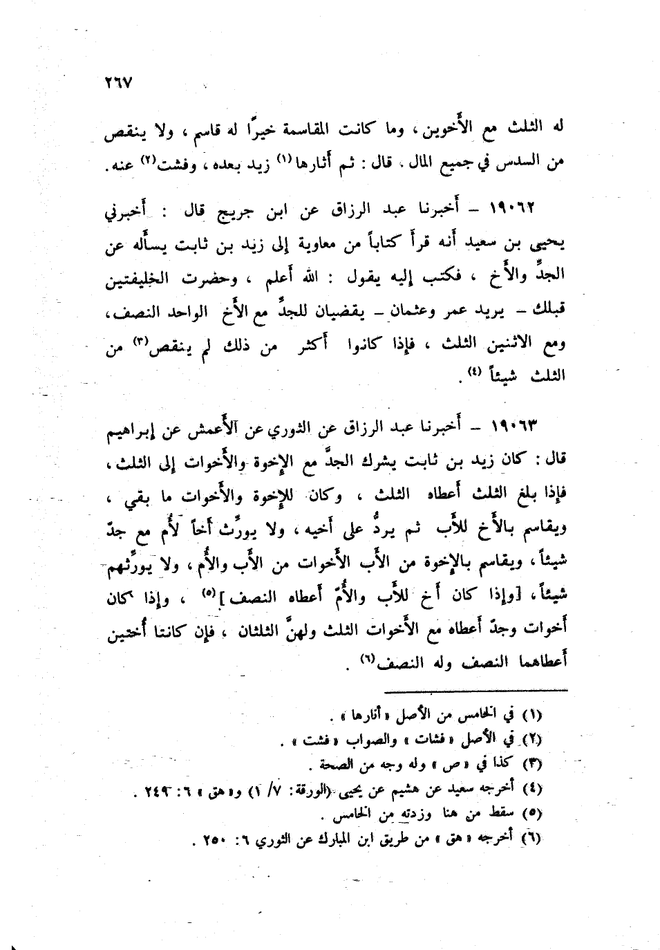 19063 - أَخْبَرَنَا عَبْدُ الرَّزَّاقِ، عَنِ الثَّوْرِيِّ , عَنِ الْأَعْمَشِ , عَنْ إِبْرَاهِيمَ , قَالَ: «كَانَ زَيْدُ بْنُ ثَابِتٍ §يُشْرِكُ الْجَدَّ مَعَ الْإِخْوَةِ , وَالْأَخَوَاتِ إِلَى الثُّلُثِ , فَإِذَا بَلَغَ الثُّلُثَ , أَعْطَاهُ الثُّلُثَ , وَكَانَ لِلْإِخْوَةِ وَالْأَخَوَاتِ مَا بَقِيَ , وَيُقَاسِمُ بِالْأَخِ لِلْأَبِ , ثُمَّ يَرُدُّ عَلَى أَخِيهِ وَلَا يُوَرِّثُ أَخًا لِأُمٍّ مَعَ جَدٍّ شَيْئًا , وَيُقَاسِمُ بِالْإِخْوَةِ مِنَ الْأَبِ , الْأَخَوَاتِ مِنَ الْأَبِ وَالْأُمِّ , وَلَا يُوَرِّثُهُمْ شَيْئًا , وَإِذَا كَانَ أَخٌ لِلْأَبِ وَالْأُمِّ أَعْطَاهُ النِّصْفَ , وَإِذَا كَانَ أَخَوَاتٌ وَجَدٌّ , أَعْطَاهُ مَعَ الْأَخَوَاتِ الثُّلُثَ , وَلَهُنَّ الثُّلُثَانِ , فَإِنْ كَانَتَا أُخْتَيْنِ , أَعْطَاهُمَا النِّصْفَ , وَلَهُ النِّصْفَ»