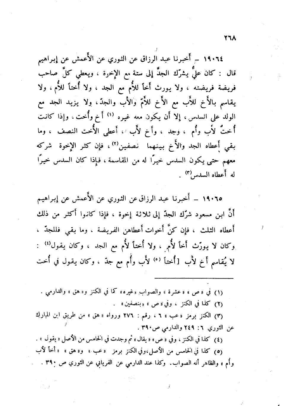 19065 - أَخْبَرَنَا عَبْدُ الرَّزَّاقِ، عَنِ الثَّوْرِيِّ , عَنِ الْأَعْمَشِ , عَنْ إِبْرَاهِيمَ , أَنَّ ابْنَ مَسْعُودٍ: §شَرَكَ الْجَدَّ إِلَى ثَلَاثَةِ إِخْوَةٍ , فَإِذَا كَانُوا أَكْثَرَ مِنْ ذَلِكَ أَعْطَاهُ الثُّلُثَ , فَإِنْ كُنَّ أَخَوَاتٍ , أَعْطَاهُنَّ الْفَرِيضَةَ , وَمَا بَقِيَ فَلِلْجَدِّ , وَكَانَ لَا يُوَرِّثُ أَخًا لِأُمٍّ , وَلَا أُخْتًا لِأُمٍّ مَعَ الْجَدِّ , وَكَانَ يَقُولُ: «لَا يُقَاسِمُ أَخٌ لِأَبٍ , أُخْتًا لِأَبٍ وَأُمٍّ مَعَ جَدٍّ , وَكَانَ يَقُولُ فِي أُخْتٍ لِأَبٍ وَأُمٍّ , وَأَخٍ لِأَبٍ وَجَدٍّ لِلْأُخْتِ لِلْأَبِ وَالْأُمِّ النِّصْفُ , وَمَا بَقِيَ فَلِلْجَدِّ , وَلَيْسَ لِلْأَخِ لِلْأَبِ شَيْءٌ»