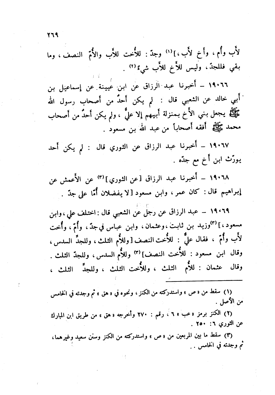 19066 - أَخْبَرَنَا عَبْدُ الرَّزَّاقِ، عَنِ ابْنِ عُيَيْنَةَ , عَنْ إِسْمَاعِيلَ بْنِ أَبِي خَالِدٍ , عَنِ الشَّعْبِيِّ , قَالَ: «§لَمْ يَكُنْ أَحَدٌ مِنْ أَصْحَابِ رَسُولِ اللَّهِ صَلَّى اللهُ عَلَيْهِ وَسَلَّمَ يَجْعَلُ بَنِي الْأَخِ بِمَنْزِلَةِ أَبِيهِمْ , إِلَّا عَلِيٌّ , وَلَمْ يَكُنْ أَحَدٌ مِنْ أَصْحَابِ مُحَمَّدٍ صَلَّى اللهُ عَلَيْهِ وَسَلَّمَ أَفْقَهَ أَصْحَابًا مِنْ عَبْدِ اللَّهِ بْنِ مَسْعُودٍ»