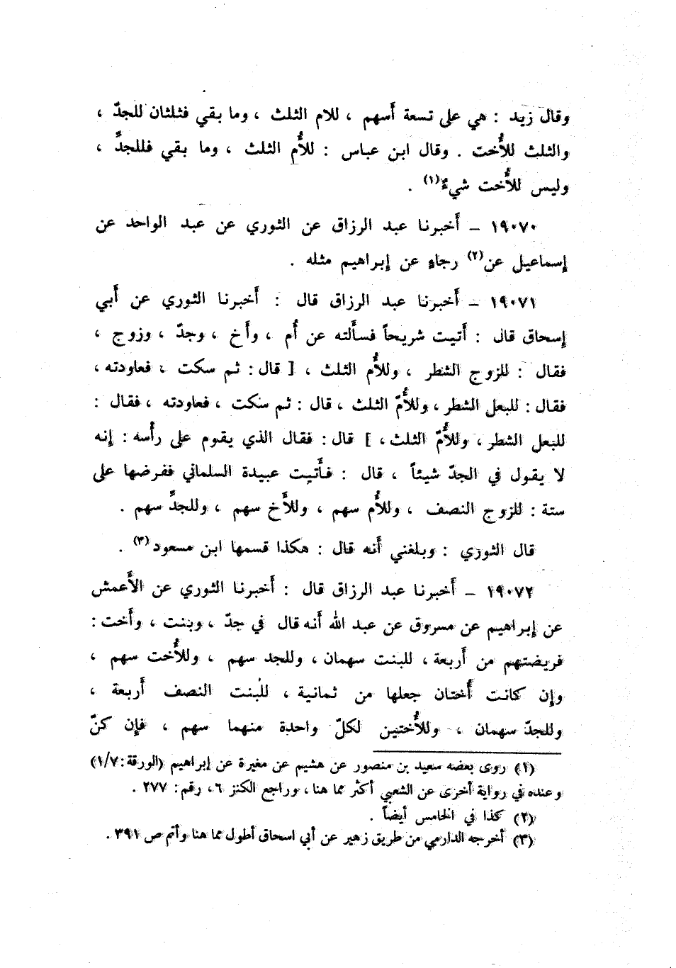 19071 - عَبْدُ الرَّزَّاقِ، أَخْبَرَنَا الثَّوْرِيُّ , عَنْ أَبِي إِسْحَاقَ , قَالَ: أَتَيْتُ شُرَيْحًا فَسَأَلْتُهُ عَنْ أُمٍّ , وَأَخٍ , وَجَدٍّ , وَزَوْجٍ , فَقَالَ: «§لِلزَّوْجِ الشَّطْرُ , وَلِلْأُمِّ الثُّلُثُ» , قَالَ: ثُمَّ سَكَتَ فَعَاوَدْتُهُ , فَقَالَ: «لِلْبَعْلِ الشَّطْرُ , وَلِلْأُمِّ الثُّلُثُ» , قَالَ: ثُمَّ سَكَتَ فَعَاوَدْتُهُ , فَقَالَ: «لِلْبَعْلِ الشَّطْرُ , وَلِلْأُمِّ الثُّلُثُ» , قَالَ: فَقَالَ الَّذِي يَقُومُ عَلَى رَأْسِهِ: إِنَّهُ لَا يَقُولُ فِي الْجَدِّ شَيْئًا قَالَ: " فَأَتَيْتُ عُبَيْدَةَ السَّلْمَانِيَّ فَفَرَضَهَا عَلَى سِتَّةٍ: لِلزَّوْجِ النِّصْفُ , وَلِلْأُمِّ سَهْمٌ , وَلِلْأَخِ سَهْمٌ , وَلِلْجَدِّ سَهْمٌ " قَالَ الثَّوْرِيُّ: وَبَلَغَنِي أَنَّهُ قَالَ: «هَكَذَا قَسَمَهَا ابْنُ مَسْعُودٍ»