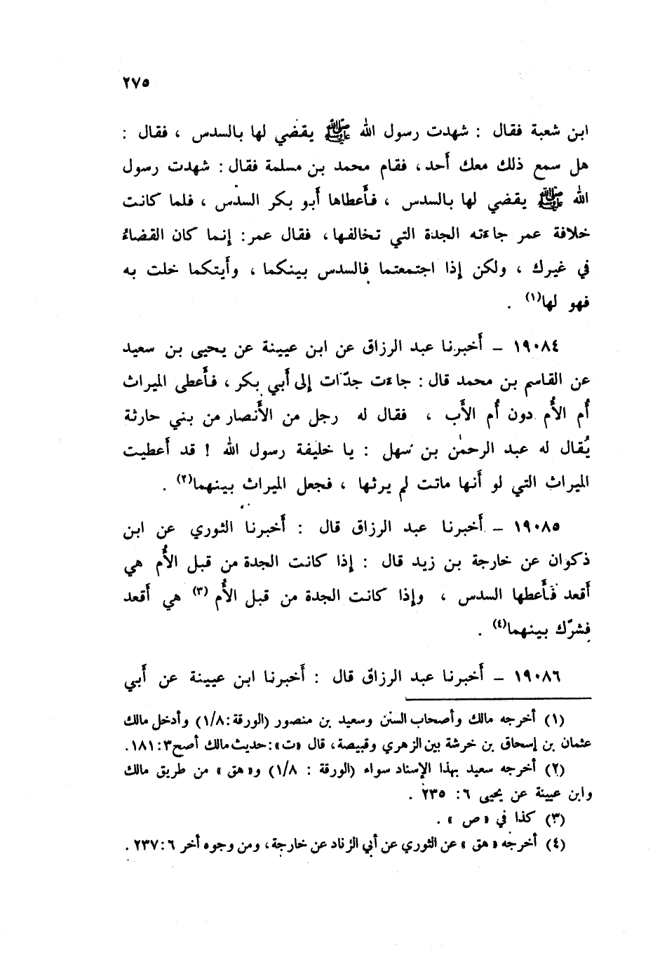 19084 - أَخْبَرَنَا عَبْدُ الرَّزَّاقِ، عَنِ ابْنِ عُيَيْنَةَ , عَنْ يَحْيَى بْنِ سَعِيدٍ , عَنِ الْقَاسِمِ بْنِ مُحَمَّدٍ , قَالَ: جَاءَتْ جَدَّاتٌ إِلَى أَبِي بَكْرٍ: «§فَأَعْطَى الْمِيرَاثَ أُمَّ الْأُمِّ دُونَ أُمِّ الْأَبِ» , فَقَالَ لَهُ رَجُلٌ مِنَ الْأَنْصَارِ مِنْ بَنِي حَارِثَةَ يُقَالُ لَهُ عَبْدُ الرَّحْمَنِ بْنُ سَهْلٍ: يَا خَلِيفَةَ رَسُولِ اللَّهِ , قَدْ أَعْطَيْتَ الْمِيرَاثَ الَّتِي لَوْ أَنَّهَا مَاتَتْ لَمْ يَرِثْهَا , «فَجَعَلَ الْمِيرَاثَ بَيْنَهُمَا»