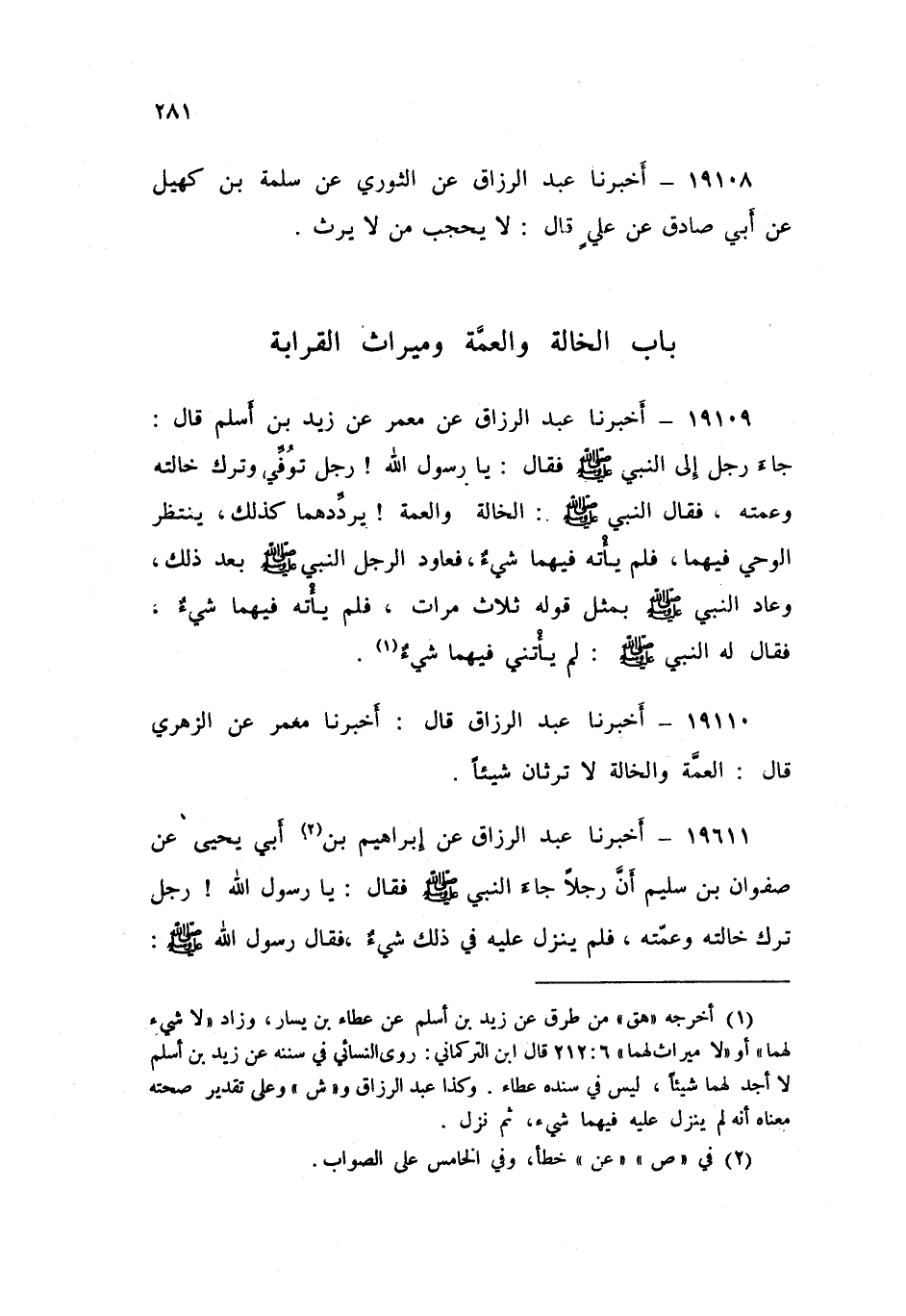 19109 - أَخْبَرَنَا عَبْدُ الرَّزَّاقِ، عَنْ مَعْمَرٍ , عَنْ زَيْدِ بْنِ أَسْلَمَ , قَالَ: جَاءَ رَجُلٌ إِلَى النَّبِيِّ صَلَّى اللهُ عَلَيْهِ وَسَلَّمَ , فَقَالَ: يَا رَسُولَ اللَّهِ , رَجُلٌ تُوُفِّيَ وَتَرَكَ خَالَتَهُ , وَعَمَّتَهُ , فَقَالَ النَّبِيُّ صَلَّى اللهُ عَلَيْهِ وَسَلَّمَ: «§الْخَالَةُ وَالْعَمَّةُ» يُرَدِّدُهُمَا , كَذَلِكَ يَنْتَظِرُ الْوَحْيَ فِيهِمَا , فَلَمْ يَأْتِهِ فِيهِمَا شَيْءٌ " فَعَاوَدَ الرَّجُلُ النَّبِيَّ صَلَّى اللهُ عَلَيْهِ وَسَلَّمَ بَعْدَ ذَلِكَ، وَعَادَ النَّبِيُّ صَلَّى اللهُ عَلَيْهِ وَسَلَّمَ بِمِثْلِ قَوْلِهِ ثَلَاثَ مَرَّاتٍ فَلَمْ يَأْتِهِ فِيهِمَا شَيْءٌ , فَقَالَ لَهُ النَّبِيُّ صَلَّى اللهُ عَلَيْهِ وَسَلَّمَ: «لَمْ يَأْتِنِي فِيهِمَا شَيْءٌ»