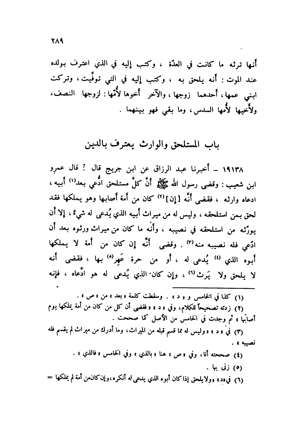 19138 - أَخْبَرَنَا عَبْدُ الرَّزَّاقِ، عَنِ ابْنِ جُرَيْجٍ قَالَ: قَالَ عَمْرُو بْنُ شُعَيْبٍ: وَقَضَى رَسُولُ اللَّهِ صَلَّى اللهُ عَلَيْهِ وَسَلَّمَ: «أَنَّ §كُلَّ مُسْتَلْحَقٍ ادُّعِيَ بَعْدَ أَبِيهِ ادَّعَاهُ وَارِثُهُ , فَقَضَى أَنَّهُ إِنْ كَانَ مِنْ أَمَةٍ أَصَابَهَا وَهُوَ يَمْلِكُهَا فَقَدْ لَحِقَ بِمَنِ اسْتَلْحَقَهُ , وَلَيْسَ لَهُ مِنْ مِيرَاثِ أَبِيهِ الَّذِي يُدْعَى لَهُ شَيْءٌ , إِلَّا أَنْ يُوَرِّثَهُ مَنِ اسْتَلْحَقَهُ فِي نَصِيبِهِ , وَأَنَّهُ مَا كَانَ مِنْ مِيرَاثٍ وَرِثُوهُ بَعْدَ أَنِ ادُّعِيَ فَلَهُ نَصِيبُهُ مِنْهُ , وَقَضَى أَنَّهُ إِنْ كَانَ مِنْ أَمَةٍ لَا يَمْلِكُهَا أَبُوهُ الَّذِي يُدْعَى لَهُ , أَوْ مِنْ حُرَّةٍ عَهَرَ بِهَا , فَقَضَى أَنَّهُ لَا يَلْحَقُ وَلَا يَرِثُ , وَإِنْ كَانَ الَّذِي يُدْعَى لَهُ هُوَ ادَّعَاهُ , فَإِنَّهُ -[290]- وَلَدُ زِنًا لِأَهْلِ أُمِّهِ مَنْ كَانُوا حُرَّةً أَوْ أَمَةً»