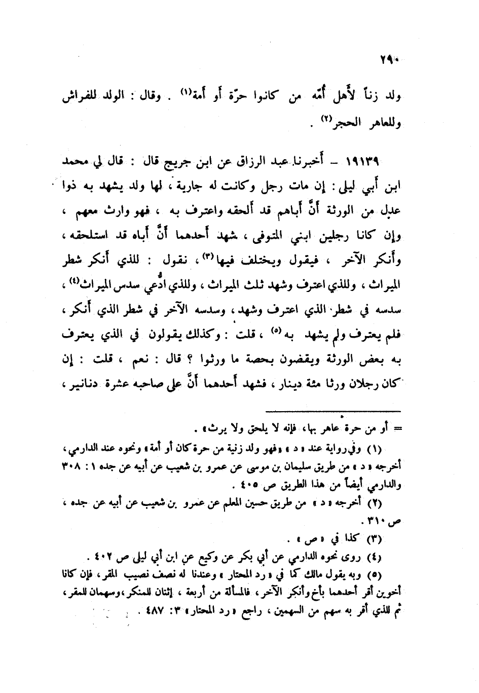 19139 - أَخْبَرَنَا عَبْدُ الرَّزَّاقِ، عَنِ ابْنِ جُرَيْجٍ قَالَ: قَالَ لِي مُحَمَّدُ بْنُ أَبِي لَيْلَى: " إِنْ §مَاتَ رَجُلٌ وَكَانَتْ لَهُ جَارِيَةٌ لَهَا وَلَدٌ يَشْهَدُ بِهِ ذَوَا عَدْلٍ مِنَ الْوَرَثَةِ أَنَّ أَبَاهُمْ قَدْ أَلْحَقَهُ وَاعْتَرَفَ بِهِ فَهُوَ وَارِثٌ مَعَهُمْ , وَإِنْ كَانَا رَجُلَيْنِ ابْنَيِ الْمُتَوَفَّى شَهِدَ أَحَدُهُمَا أَنَّ أَبَاهُ قَدِ اسْتَلْحَقَهُ وَأَنْكَرَ الْآخَرُ فَيَقُولُ: وَيُخْتَلَفُ فِيهَا , نَقُولُ: لِلَّذِي أَنْكَرَ شَطْرُ الْمِيرَاثِ , وَلِلَّذِي اعْتَرَفَ وَشَهِدَ ثُلُثُ الْمِيرَاثِ , وَلِلَّذِي ادُّعِيَ سُدُسُ الْمِيرَاثِ , سُدُسُهُ فِي شَطْرِ الَّذِي اعْتَرَفَ وَشَهِدَ , وَسُدُسُهُ الْآخَرُ فِي شَطْرِ الَّذِي أَنْكَرَ، فَلَمْ يَعْتَرِفْ وَلَمْ يَشْهَدْ بِهِ " , قُلْتُ: وَكَذَلِكَ يَقُولُونَ فِي الَّذِي يَعْتَرِفُ بِهِ بَعْضُ الْوَرَثَةِ وَيَقْضُونَ بِحِصَّةِ مَا وَرِثُوا؟ قَالَ: «نَعَمْ» , قُلْتُ: إِنْ كَانَ رَجُلَانِ وَرِثَا مِائَةَ دِينَارٍ فَشَهِدَ أَحَدُهُمَا أَنَّ عَلَى صَاحِبِهِ عَشَرَةَ دَنَانِيرَ , -[291]- وَأَنْكَرَ الْآخَرُ «قَضَى الَّذِي شَهِدَ خَمْسَةً» قَالَ: مُحَمَّدٌ: لَا نَرْفَعُ شَيْئًا مِنْ هَذَا إِلَى أَصْحَابِ النَّبِيِّ صَلَّى اللهُ عَلَيْهِ وَسَلَّمَ وَلَكِنْ إِلَى فُقَهَائِنَا دُونَ ذَلِكَ قَالَ: ابْنُ جُرَيْجٍ: وَأَقُولُ أَنَا: «إِنْ شَهِدَ وَاحِدٌ مِنَ الْوَرَثَةِ عَلَى حَقٍّ لِقَوْمٍ وَأَنْكَرَ الْآخَرُونَ فَيَمِينُ الطَّالِبِ مَعَ شَهَادَتِهِ»