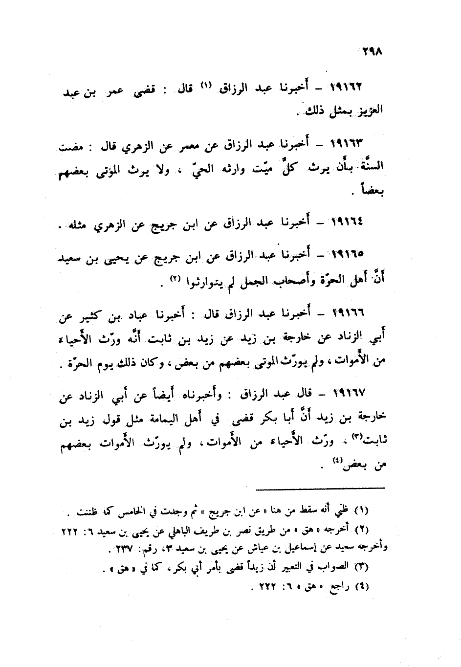 19165 - أَخْبَرَنَا عَبْدُ الرَّزَّاقِ، 140 عَنِ ابْنِ جُرَيْجٍ , عَنْ يَحْيَى بْنِ سَعِيدٍ: «أَنَّ §أَهْلَ الْحَرَّةَ وَأَصْحَابَ الْجَمَلِ لَمْ يَتَوَارَثُوا»