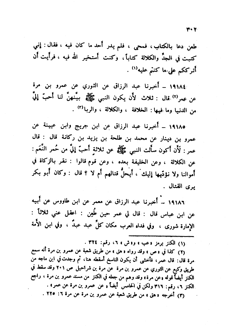 19186 - أَخْبَرَنَا عَبْدُ الرَّزَّاقِ، عَنْ مَعْمَرٍ , عَنِ ابْنِ طَاوُسٍ , عَنْ أَبِيهِ , عَنِ ابْنِ عَبَّاسٍ , قَالَ: قَالَ لِي عُمَرُ حِينَ طُعِنَ: " اعْقِلْ عَنِّي ثَلَاثًا: §الْإِمَارَةُ شُورَى , وَفِي فِدَاءِ الْعَرَبِ مَكَانَ كُلِّ عَبْدٍ عَبْدٌ , وَفِي ابْنِ الْأَمَةِ عَبْدَانِ , وَفِي الْكَلَالَةِ مَا قُلْتُ " , قَالَ: قُلْتُ لِابْنِ طَاوُسٍ: مَا قَالَ؟ فَأَبَى أَنْ يُخْبِرَنِي