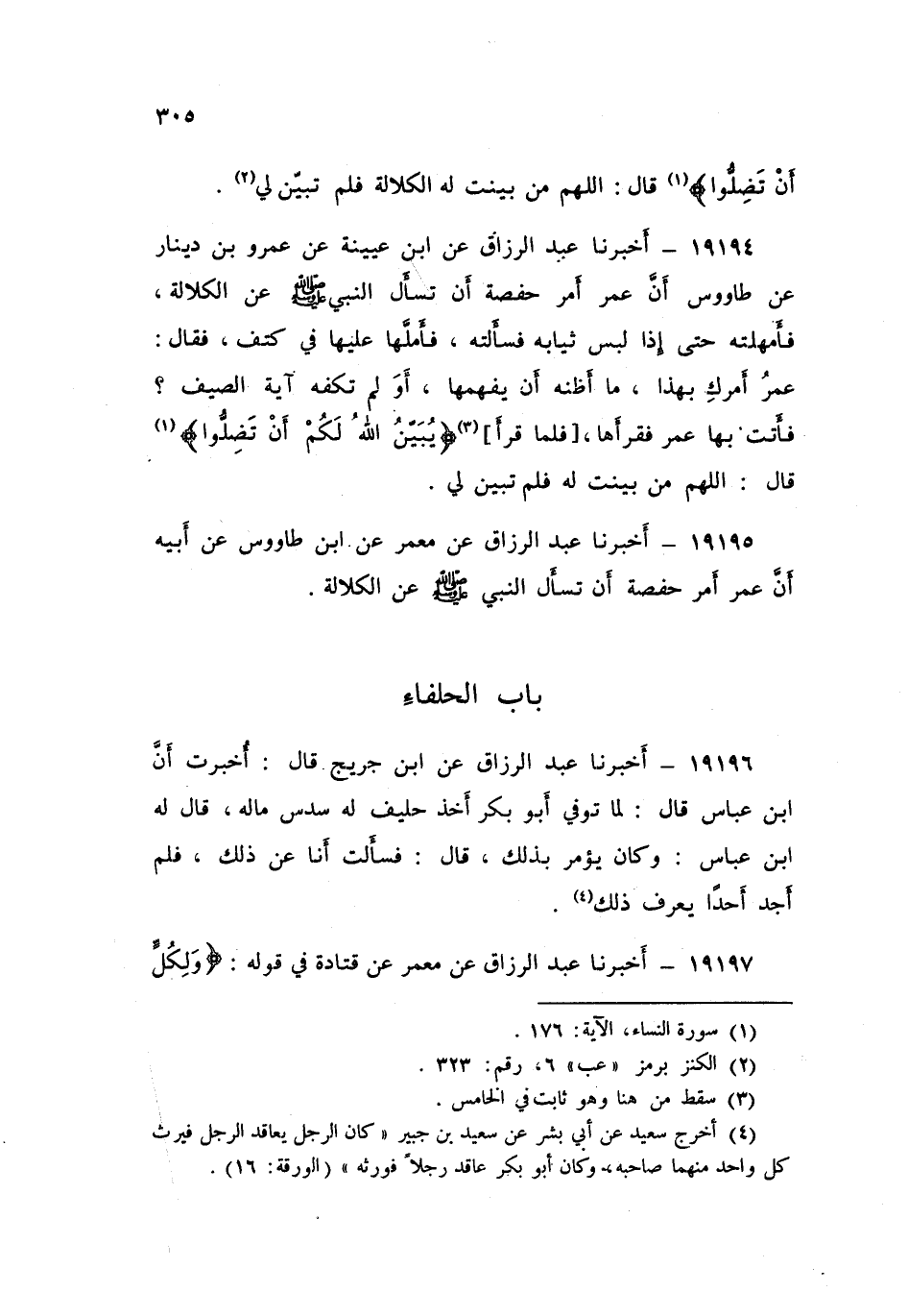 19194 - أَخْبَرَنَا عَبْدُ الرَّزَّاقِ، عَنِ ابْنِ عُيَيْنَةَ , عَنْ عَمْرِو بْنِ دِينَارٍ , عَنْ طَاوُسٍ أَنَّ عُمَرَ أَمَرَ حَفْصَةَ أَنْ تَسْأَلَ النَّبِيَّ صَلَّى اللهُ عَلَيْهِ وَسَلَّمَ عَنْ §الْكَلَالَةِ فَأَمْهَلَتْهُ حَتَّى إِذَا لَبِسَ ثِيَابَهُ فَسَأَلَتْهُ , «فَأَمْلَهَا عَلَيْهَا فِي كَتِفٍ» , فَقَالَ عُمَرُ: أَمَرَكِ بِهَذَا , «مَا أَظُنُّهُ أَنْ يَفْهَمَهَا أَوَلَمْ تَكْفِهِ آيَةُ الصَّيْفِ» , فَأَتَتْ بِهَا عُمَرَ فَقَرَأَهَا فَلَمَّا قَرَأَ: {يُبَيِّنُ اللَّهُ لَكُمْ أَنْ تَضِلُّوا} [النساء: 176] , قَالَ: اللَّهُمَّ مِنْ بَيَّنْتَ لَهُ فَلَمْ تُبَيِّنْ لِي
