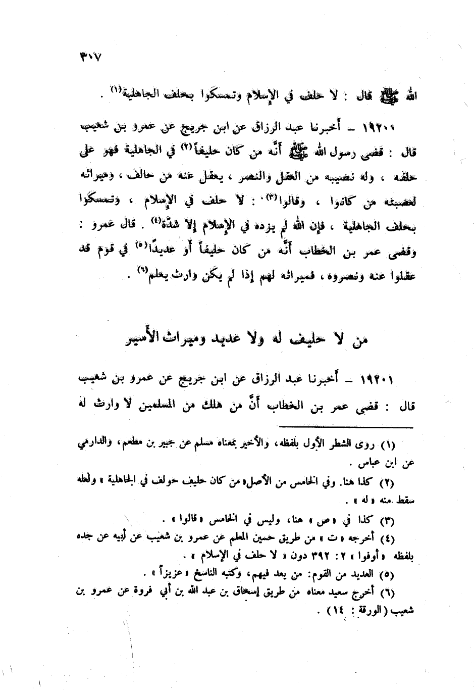 19200 - أَخْبَرَنَا عَبْدُ الرَّزَّاقِ، عَنِ ابْنِ جُرَيْجٍ , عَنْ عَمْرِو بْنِ شُعَيْبٍ , قَالَ: «قَضَى رَسُولُ اللَّهِ صَلَّى اللهُ عَلَيْهِ وَسَلَّمَ أَنَّهُ §مَنْ كَانَ حَلِيفًا فِي الْجَاهِلِيَّةِ فَهُوَ عَلَى حِلْفِهِ وَلَهُ نَصِيبُهُ مِنَ الْعَقْلِ وَالنَّصْرِ , يَعْقِلُ عَنْهُ مِنْ حَالَفَ وَمِيرَاثُهُ لِعَصَبَتِهِ مِنْ كَانُوا» , وَقَالُوا: «لَا حِلْفَ فِي الْإِسْلَامِ , وَتَمَسَّكُوا بِحِلْفِ الْجَاهِلِيَّةِ , فَإِنَّ اللَّهَ لَمْ يَزِدْهُ فِي الْإِسْلَامِ إِلَّا شِدَّةً» قَالَ عَمْرٌو: «وَقَضَى عُمَرُ بْنُ الْخَطَّابِ أَنَّهُ مَنْ كَانَ حَلِيفًا أَوْ عَدِيدًا فِي قَوْمٍ قَدْ عَقَلُوا عَنْهُ وَنَصَرُوهُ , فَمِيرَاثُهُ لَهُمْ إِذَا لَمْ يَكُنْ وَارِثٌ يُعْلَمُ»