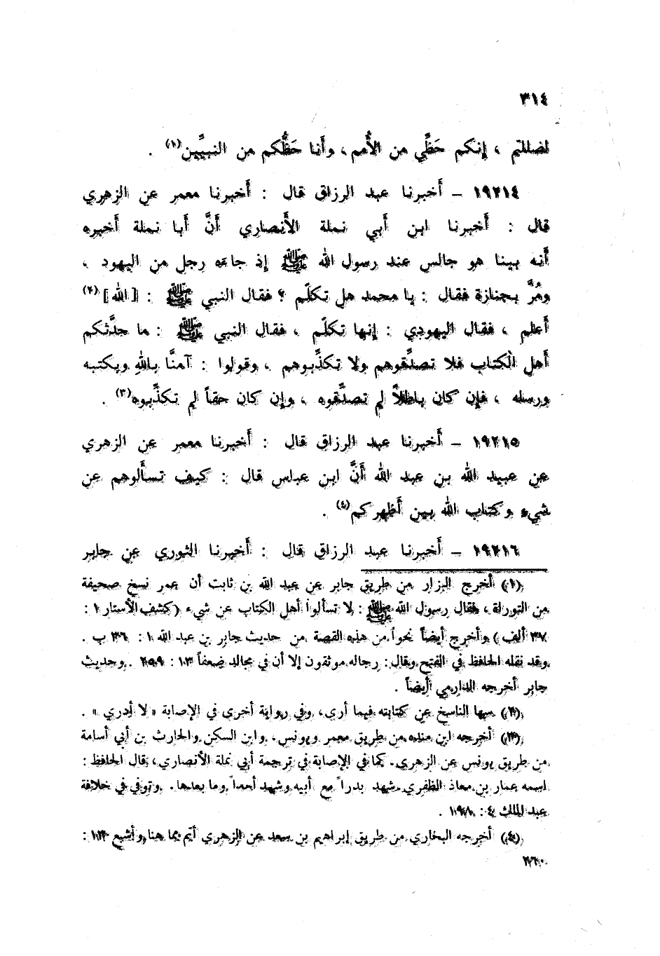 19214 - عَبْدُ الرَّزَّاقِ، أَخْبَرَنَا مَعْمَرٌ , عَنِ الزُّهْرِيِّ , قَالَ: أَخْبَرَنَا ابْنُ أَبِي نَمْلَةَ الْأَنْصَارِيُّ أَنَّ أَبَا نَمْلَةَ أَخْبَرَهُ أَنَّهُ بَيْنَا هُوَ جَالِسٌ عِنْدَ رَسُولِ اللَّهِ صَلَّى اللهُ عَلَيْهِ وَسَلَّمَ إِذْ جَاءَهُ رَجُلٌ مِنَ الْيَهُودِ وَمُرَّ بِجِنَازَةٍ , فَقَالَ: يَا مُحَمَّدُ هَلْ تَكَلَّمُ؟ فَقَالَ النَّبِيُّ صَلَّى اللهُ عَلَيْهِ وَسَلَّمَ: «اللَّهُ أَعْلَمُ» , فَقَالَ: الْيَهُودِيُّ: إِنَّهَا تَكَلَّمُ , فَقَالَ النَّبِيُّ صَلَّى اللهُ عَلَيْهِ وَسَلَّمَ: " §مَا حَدَّثَكُمْ أَهْلُ الْكِتَابِ فَلَا تُصَدِّقُوهُمْ وَلَا تُكَذِّبُوهُمْ، وَقُولُوا: آمَنَّا بِاللَّهِ وَبِكُتُبِهِ وَرُسُلِهِ، فَإِنْ كَانَ بَاطِلًا لَمْ تُصَدِّقُوهُ , وَإِنْ كَانَ حَقًّا لَمْ تُكَذِّبُوهُ "