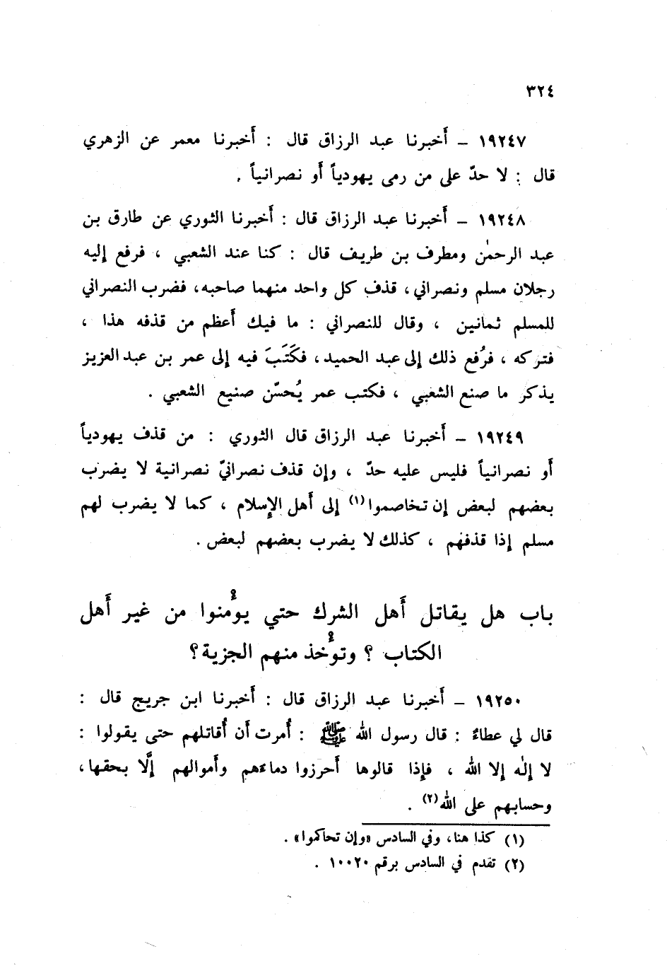 19248 - عَبْدُ الرَّزَّاقِ قال: أَخْبَرَنَا الثَّوْرِيُّ , عَنْ طَارِقِ بْنِ عَبْدِ الرَّحْمَنِ , وَمُطَرِّفِ بْنِ طَرِيفٍ , قَالَ: كُنَّا عِنْدَ الشَّعْبِيِّ " فَرُفِعَ إِلَيْهِ §رَجُلَانِ مُسْلِمٌ وَنَصْرَانِيٌّ قَذَفَ كُلُّ وَاحِدٍ مِنْهُمَا صَاحِبَهُ , فَضَرَبَ النَّصْرَانِيَّ لِلْمُسْلِمِ ثَمَانِينَ , وَقَالَ لِلنَّصْرَانِيِّ: مَا فِيكَ أَعْظَمُ مِنْ قَذْفِهِ هَذَا , فَتَرَكَهُ «, فَرُفِعَ ذَلِكَ إِلَى عَبْدِ الْحَمِيدِ فَكَتَبَ فِيهِ إِلَى عُمَرَ بْنِ عَبْدِ الْعَزِيزِ يَذْكُرُ مَا صَنَعَ الشَّعْبِيُّ فَكَتَبَ عُمَرُ يُحَسِّنُ صَنِيعَ الشَّعْبِيِّ»