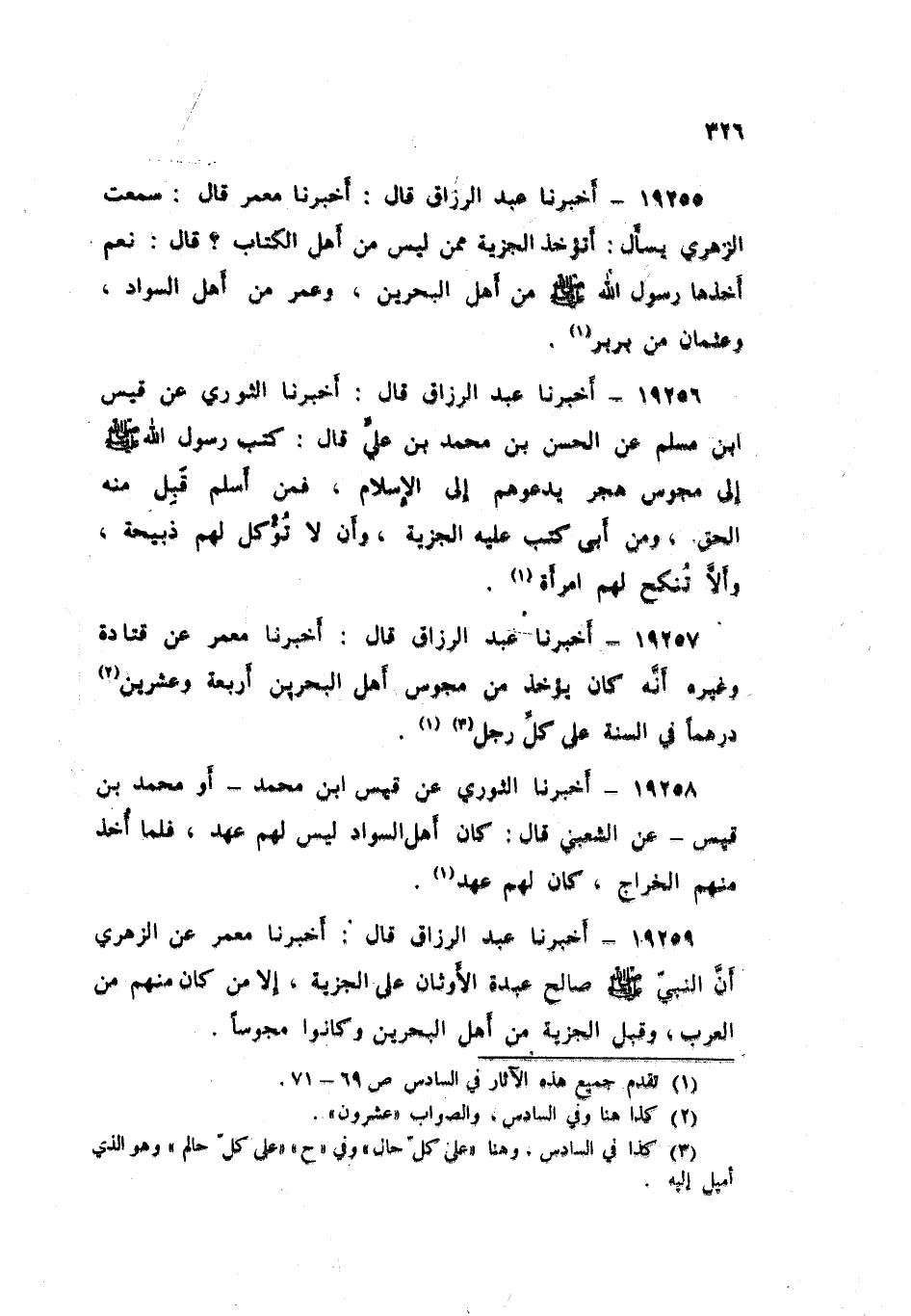 19259 - عَبْدُ الرَّزَّاقِ قال: أَخْبَرَنَا مَعْمَرٌ , عَنِ الزُّهْرِيِّ , «أَنَّ النَّبِيَّ صَلَّى اللهُ عَلَيْهِ وَسَلَّمَ §صَالَحَ عَبْدَةَ الْأَوْثَانِ عَلَى الْجِزْيَةِ , إِلَّا مَنْ كَانَ مِنْهُمْ مِنَ الْعَرَبِ وَقَبِلَ الْجِزْيَةَ مِنْ أَهْلِ الْبَحْرَيْنِ وَكَانُوا مَجُوسًا»