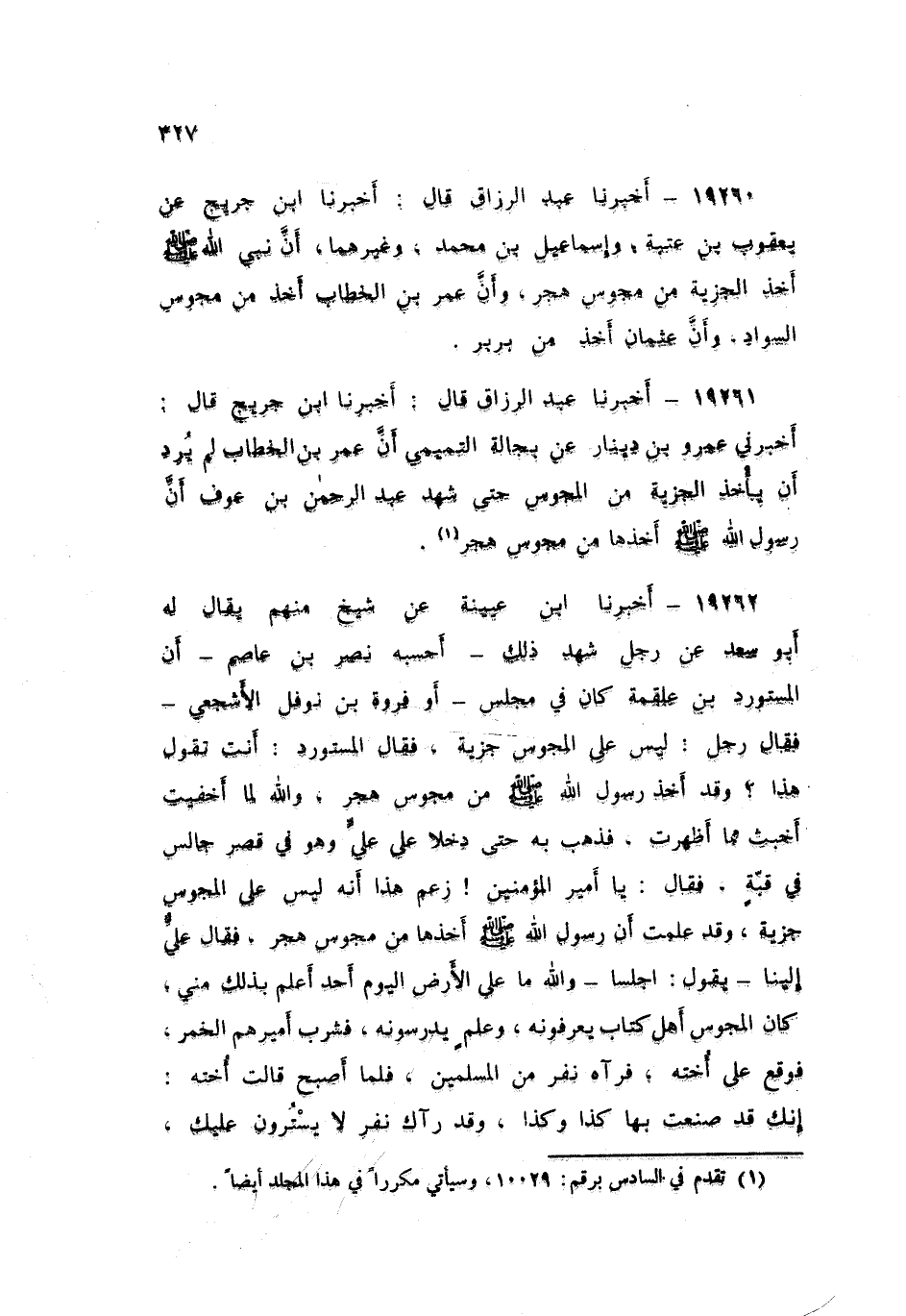 19261 - عَبْدُ الرَّزَّاقِ قال: أَخْبَرَنَا ابْنُ جُرَيْجٍ , قَالَ: أَخْبَرَنِي عَمْرُو بْنُ دِينَارٍ , عَنْ بَجَالَةَ التَّمِيمِيِّ , أَنَّ عُمَرَ بْنَ الْخَطَّابِ لَمْ يُرِدْ أَنْ يَأْخُذَ الْجِزْيَةَ مِنَ الْمَجُوسِ حَتَّى شَهِدَ عَبْدُ الرَّحْمَنِ بْنُ عَوْفٍ: «أَنَّ رَسُولَ اللَّهِ صَلَّى اللهُ عَلَيْهِ وَسَلَّمَ §أَخَذَهَا مِنْ مَجُوسِ هَجَرَ»